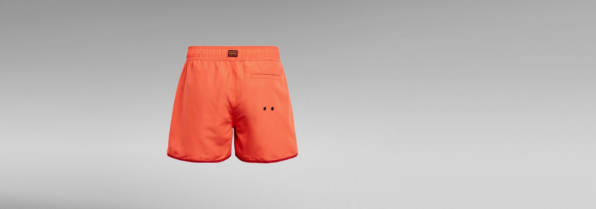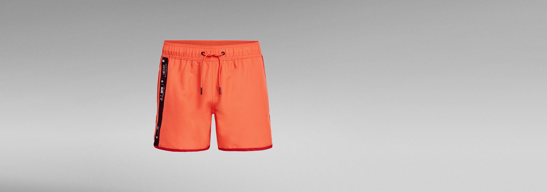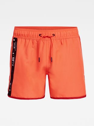These Dend Tape swim shorts feature an elastic waistband with an incorporated drawcord. The rounded hem offers small slits at the sides and a contrast binding. A woven G-Star RAW tape is placed at the front leg. The back shows a slim welt pocket. Inside, a mesh lining adds support.