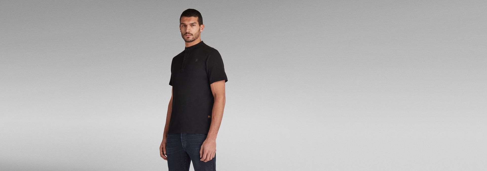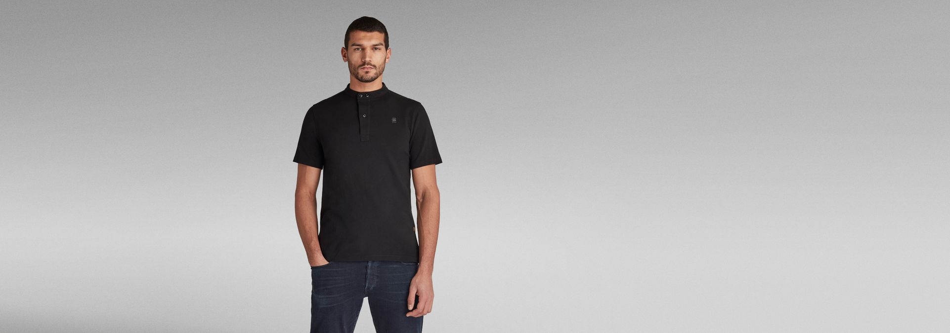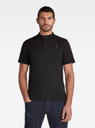 The Scan Collar polo shows a band collar. The placket is widened at the top, offering a 3-button closure. The seams at the shoulders are placed forward. This short sleeved polo shows a straight hem and side slits.