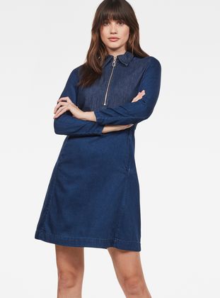 Drawing together unexpected details, this dress unites a playful silhouette with the toughness of denim. Made to throw on and go, it's cut with a slim body and loose, ruffled skirt. A zip up shirt collar adds extra interest.