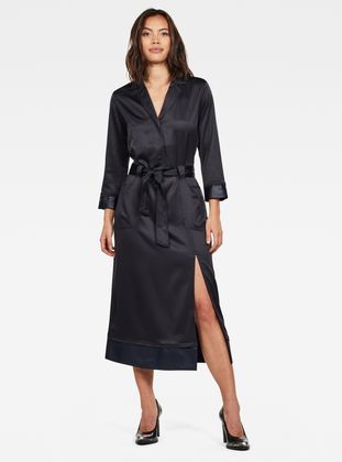This longer length Workwear PJ midi dress is designed with several rows off stitching along the lapel collar, pockets and lower hem. The front closure runs towards the waist and features hidden snaps. The waist pockets start at the waistband belt loops and grow on to a patched on pockets that are placed towards the sides. A slim welt pocket is set at the backside. The belt offers the possibility to tighten the waistline to your personal preference, while the long slit at front creates an even more feminine look.