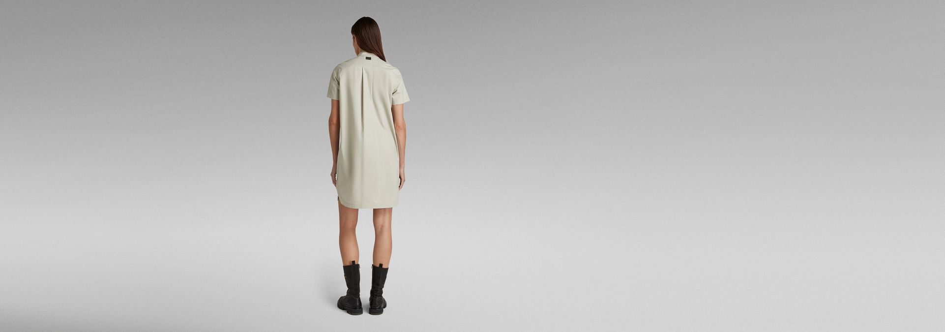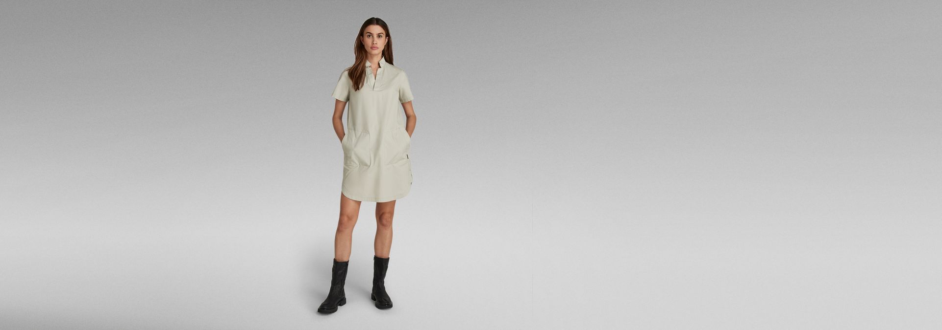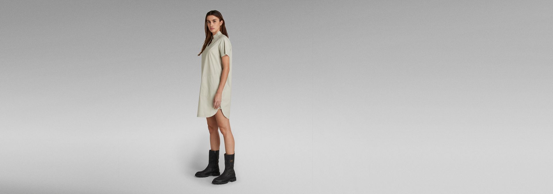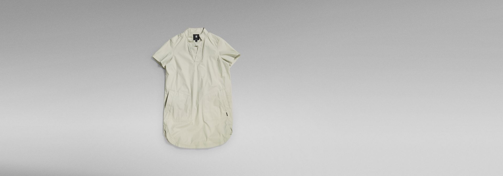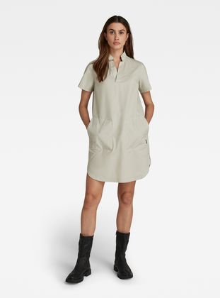 The Millery V-neck shirt dress offers an open placket with a raised collar. Waist pockets are caught in the angled side seam and are finished with a broad welt. The bottom edge of this dress is cut rounded. The sides offer an inset piece to reduce the side slit length.