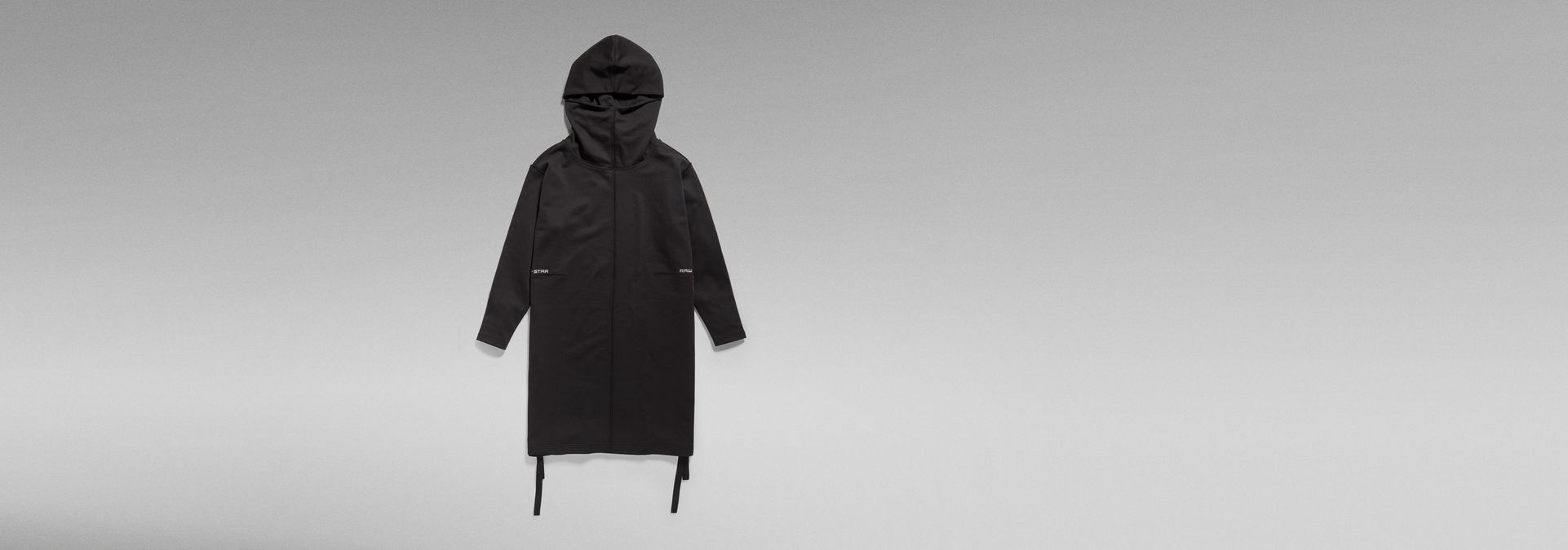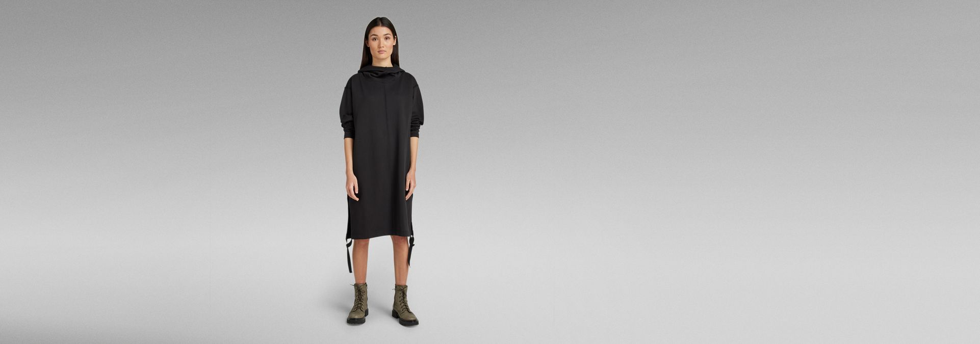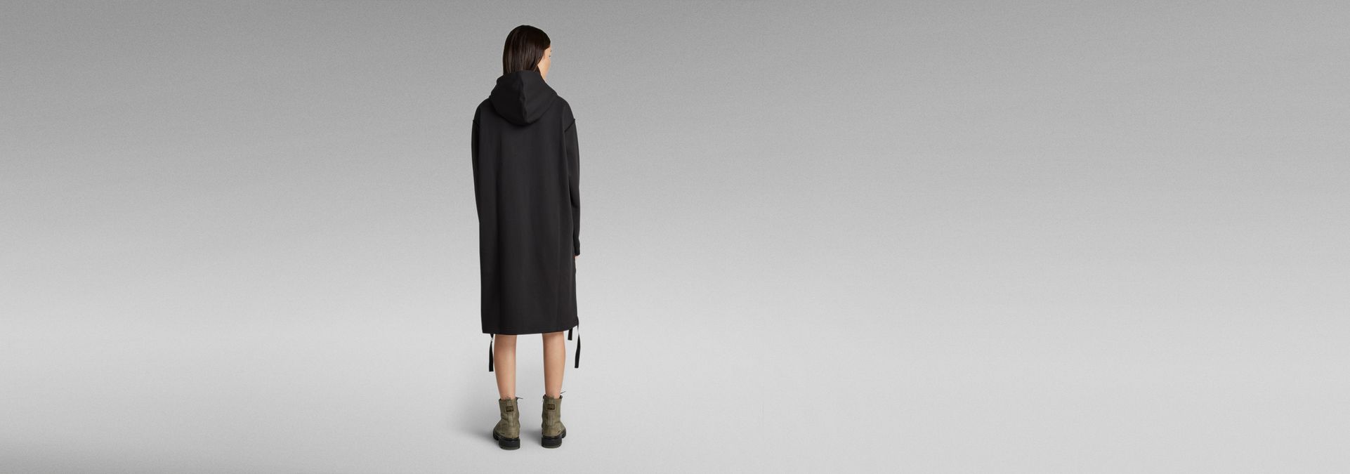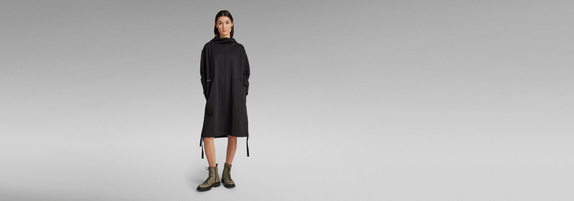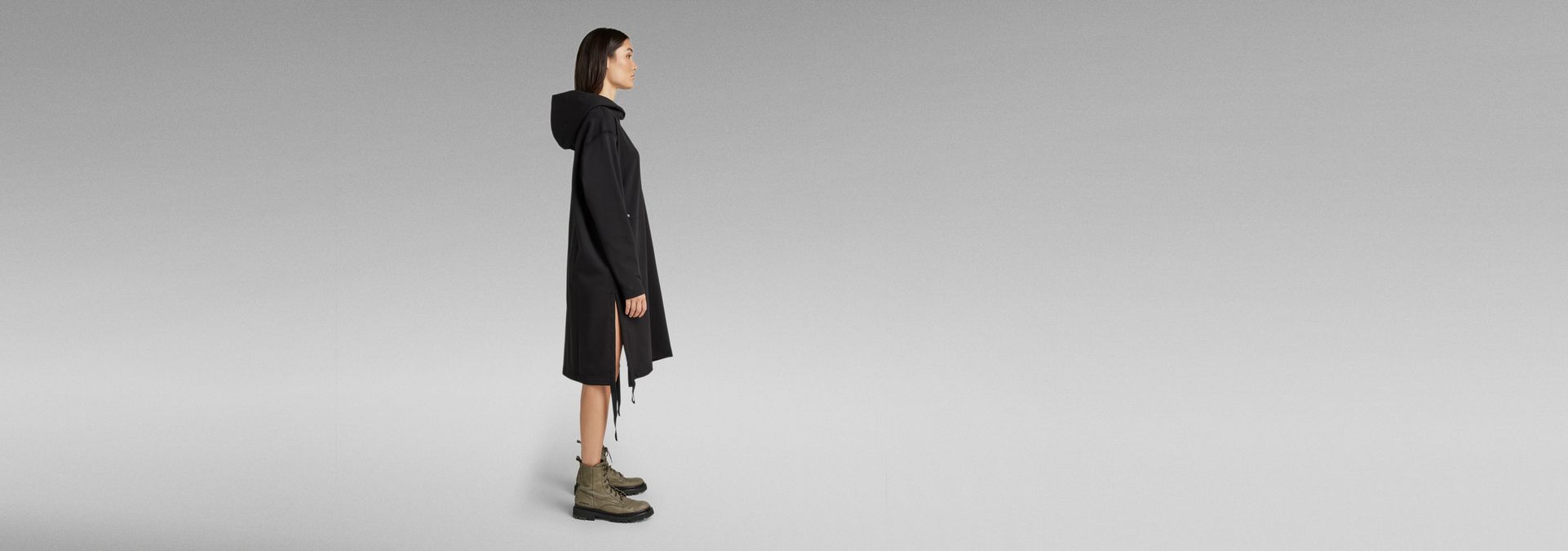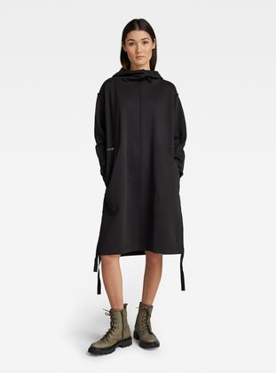 This hoodie sweat dress is designed in a maxi length and offers a loose fit. The roomy hood offers a raised front for a comfortable wear. This dress shows pockets and deep slits at the sides. The woven tape alongside allows for a semi-closed slit if preferred. Graphic prints at the waist complete this hooded dress.