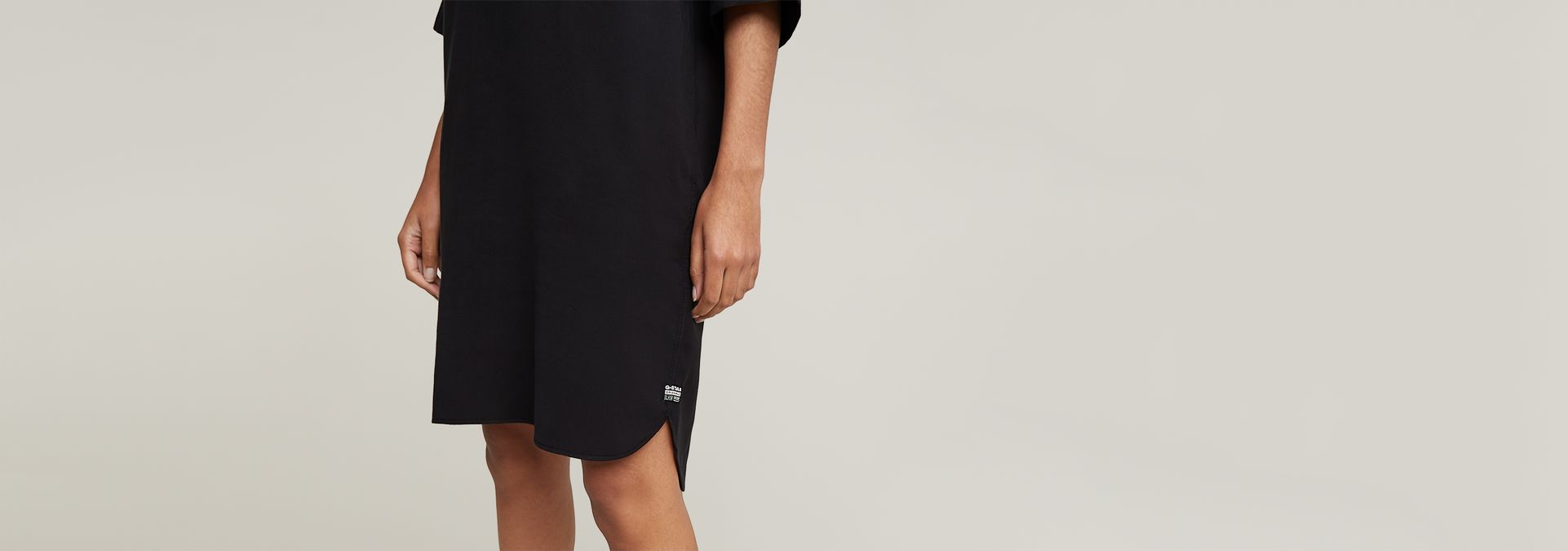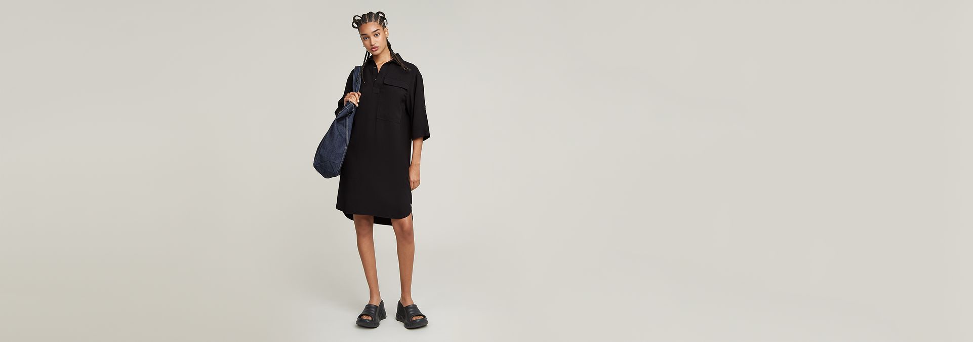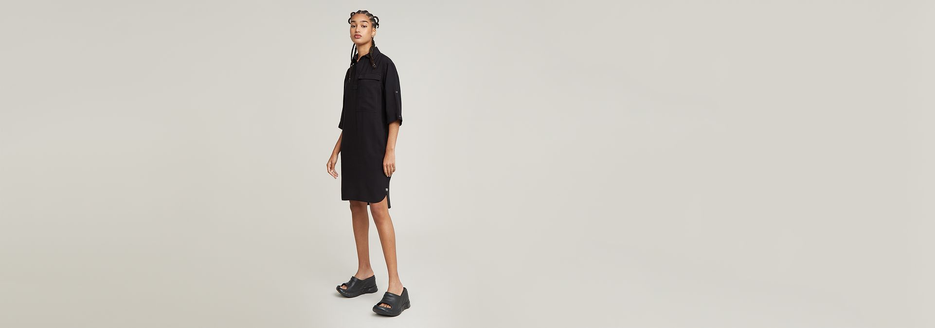 This shirt dress offers a knee length design in a loose fit. The sleeves are kept slightly longer and can be reduced in length by use of the snap button applied.