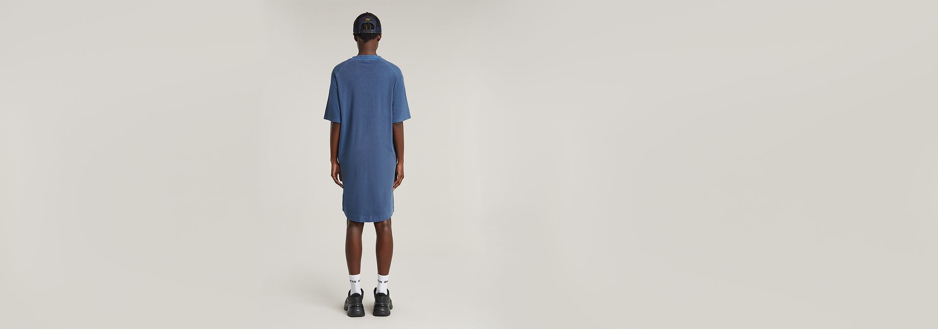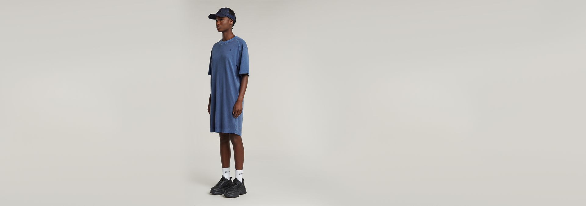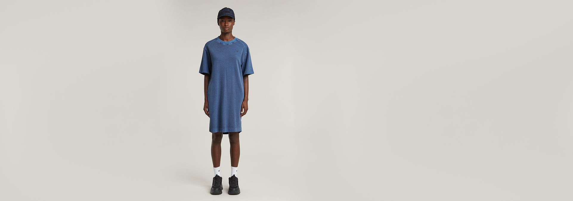 T-shirt dress Overdyed Saddle Sleeve is designed in a relaxed, loose fit and reaches the knee. Pockets are integrated in the side seams. The short sleeves are kept slightly longer.