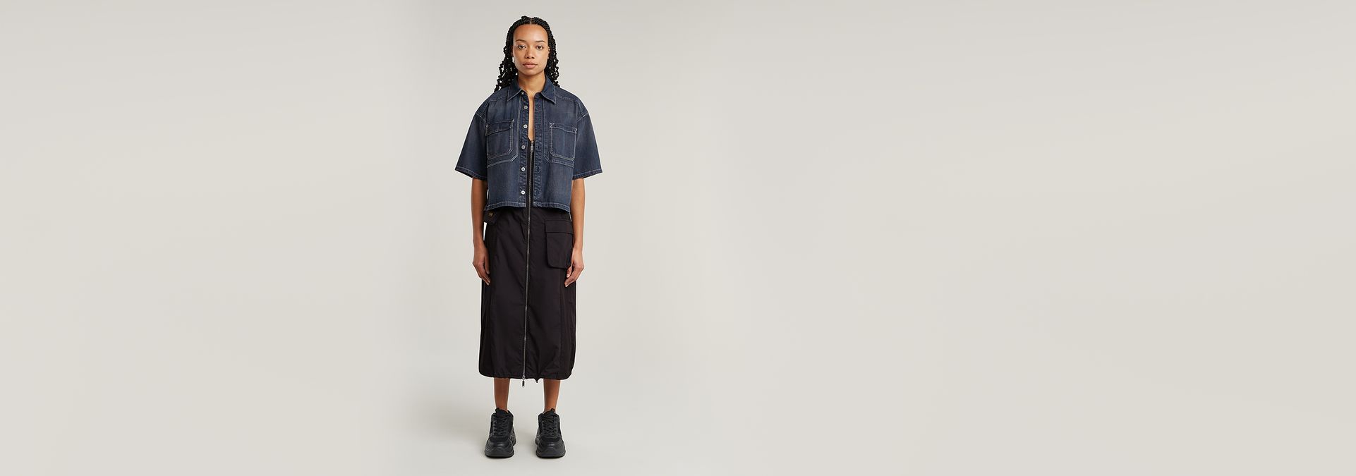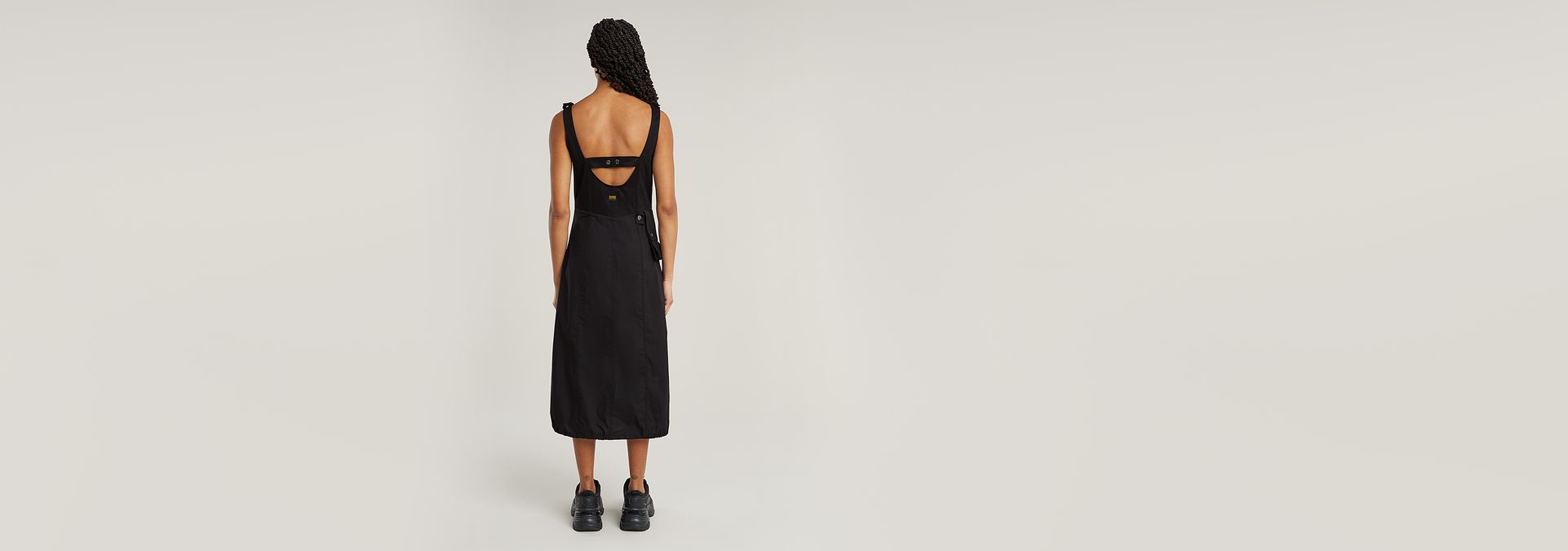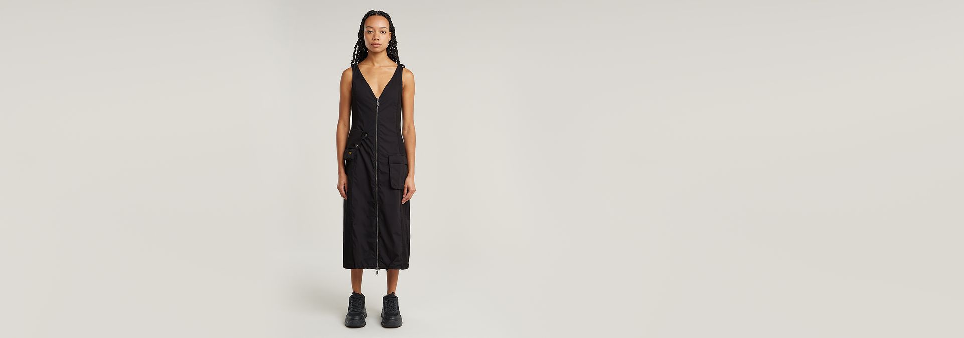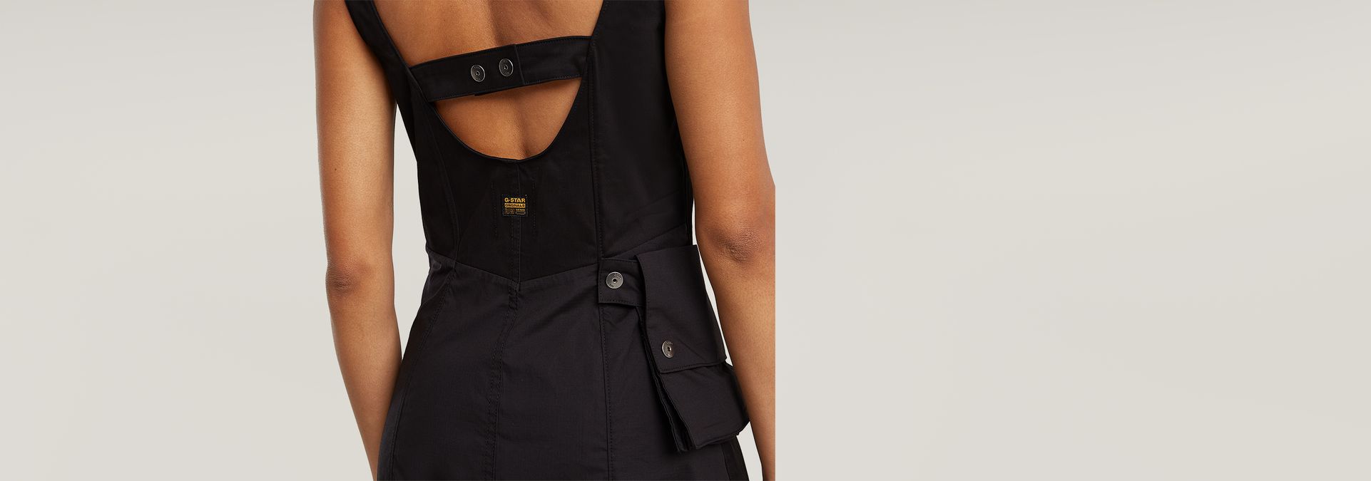Dress Cargo is cut in a slim fit, offering a wider skirt. Open the bottom of the zipper to create a slit at the front. The cords inside the hem allow for a tighter edge and more volume. 3D pockets are created at the hip and waist. The one at the waist is detachable. Tabs at the shoulder add detail.