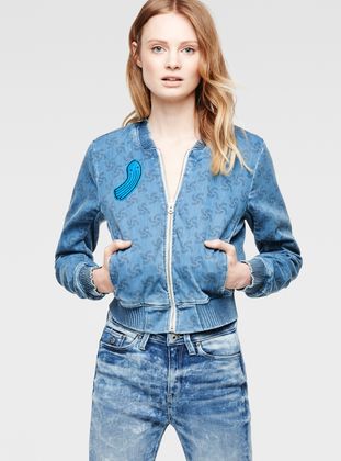 Cropped denim bomber with sporty ribbed collar, cuffs and hem. Hand pockets secure with snaps. Inside is fully lined.