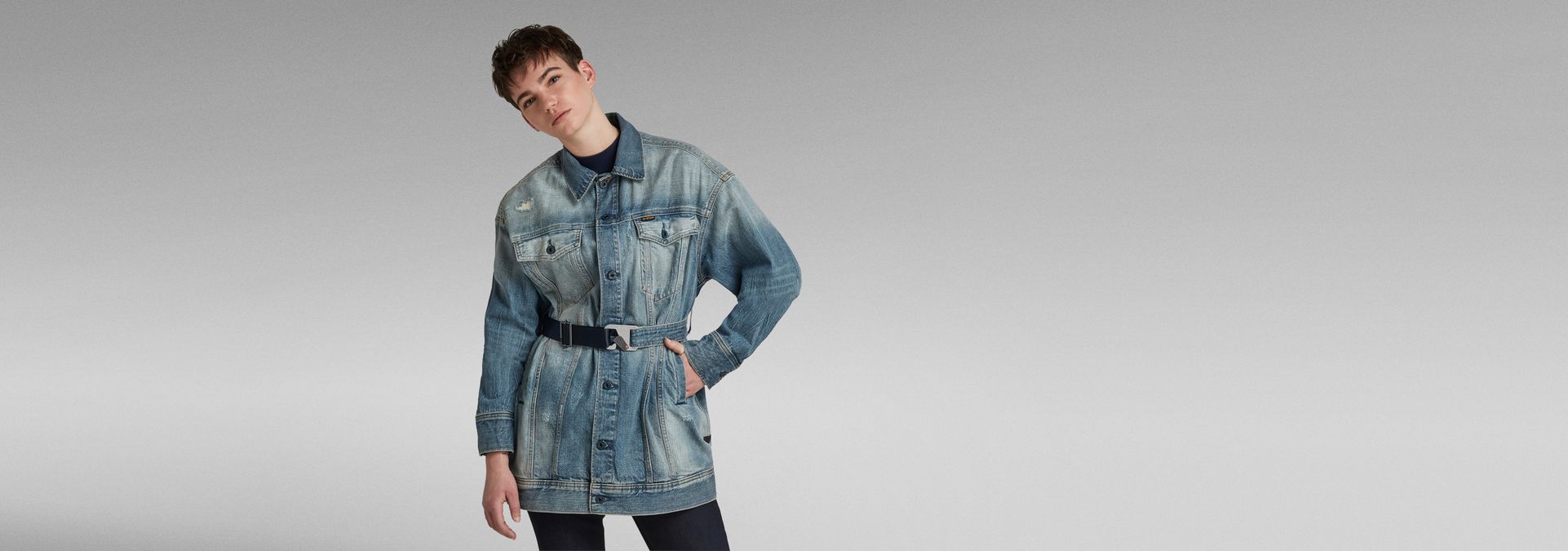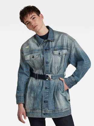 This is a Cradle to Cradle Certified® Gold G-Star RAW product. Designed for circularity, this style is made responsibly and is 100% recyclable. Not a drop of water was wasted during its make and chemistry applied in the process presents zero risk for people and planet. Furthermore, this garment was created using electricity from 100% renewable resources. The G-Star 3301 XXL Boyfriend jacket is a classic constructed denim jacket, executed in a loose oversized fit. The woven tape with carabiner closure is caught by beltloops at the sides and offers adjustability to the waist.