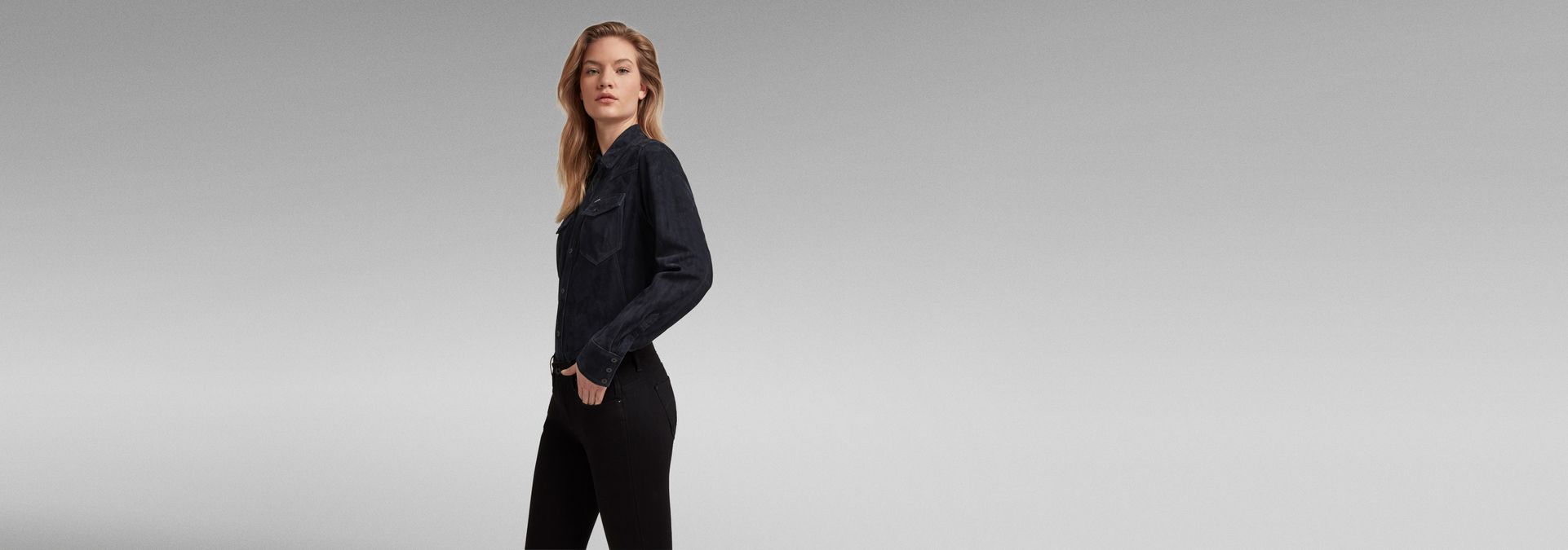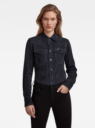 This version of the Western Kick slim shirt is created out of sued leather. A shaped silhouette is created by use of paneling. The front side shows a straight fit whereas the backside offers a tighter back waist that proceeds in a wider fit around the hips. This shirt offers a curved hem.