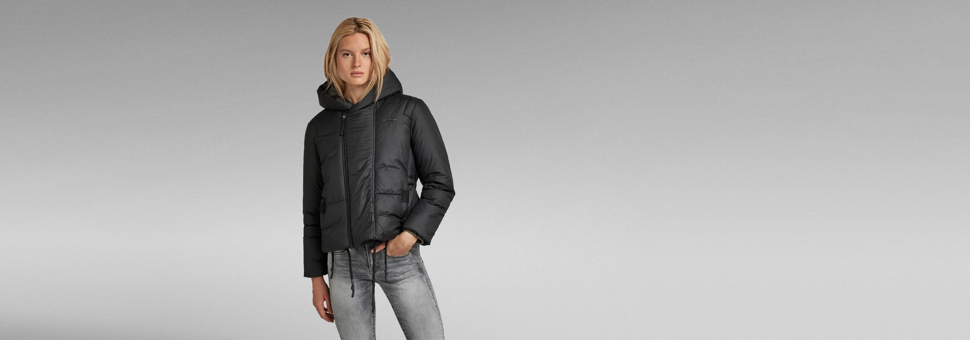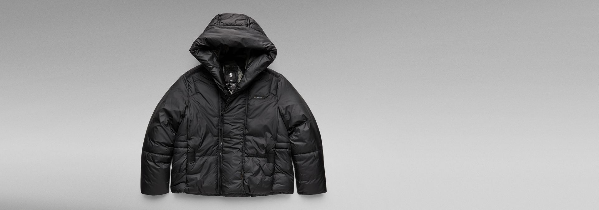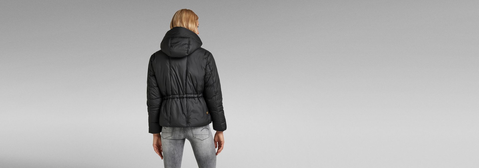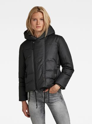 This G-Whistler short padded jacket is cut from a water repellent fabric and offers a roomy peak hood with a ribbed collar inside. The front zipper closure is placed off center and features a wind guard underneath with hidden snaps. The waist as well as the straight hem can be tightened, as there is a puller cord hidden inside. This padded jacket offers pockets at the waist and has an inside pocket as well. Woven tape creates detail at the pocket entrance, the front shoulder and the inside back.