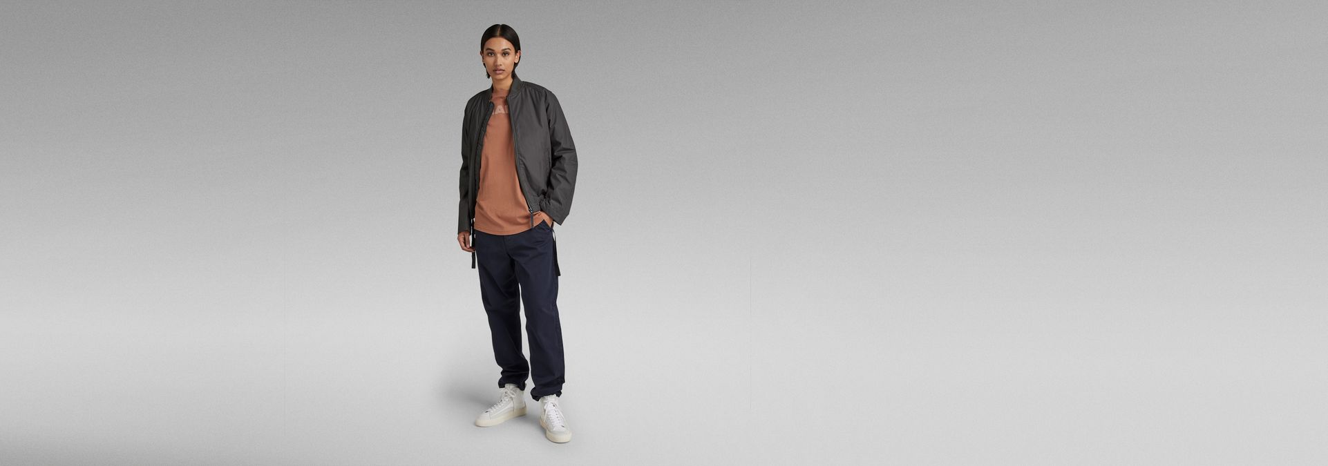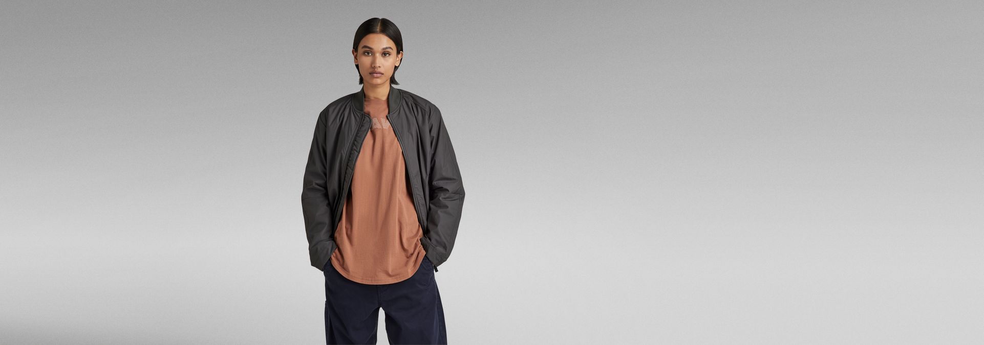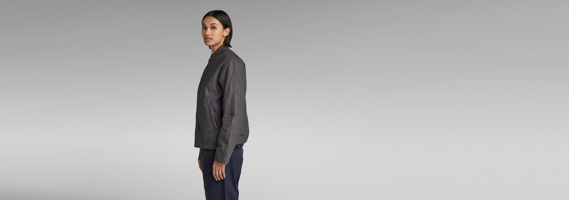 Overshirt Bomber is fully lined and offers a soft padding. The bottom edge is adjustable through the woven tape hidden inside. This way, more volume can be created. Welt pockets are added to the waist. This bomber shows a ribbed neckline and a zipper closure. A hanger loop is added for ease.