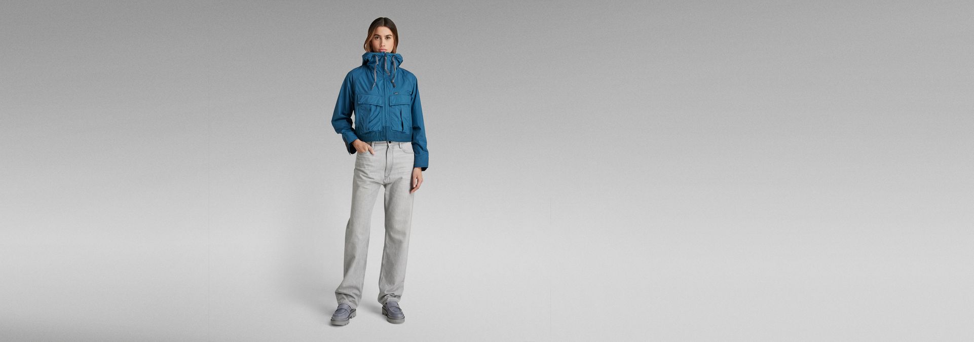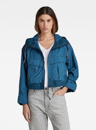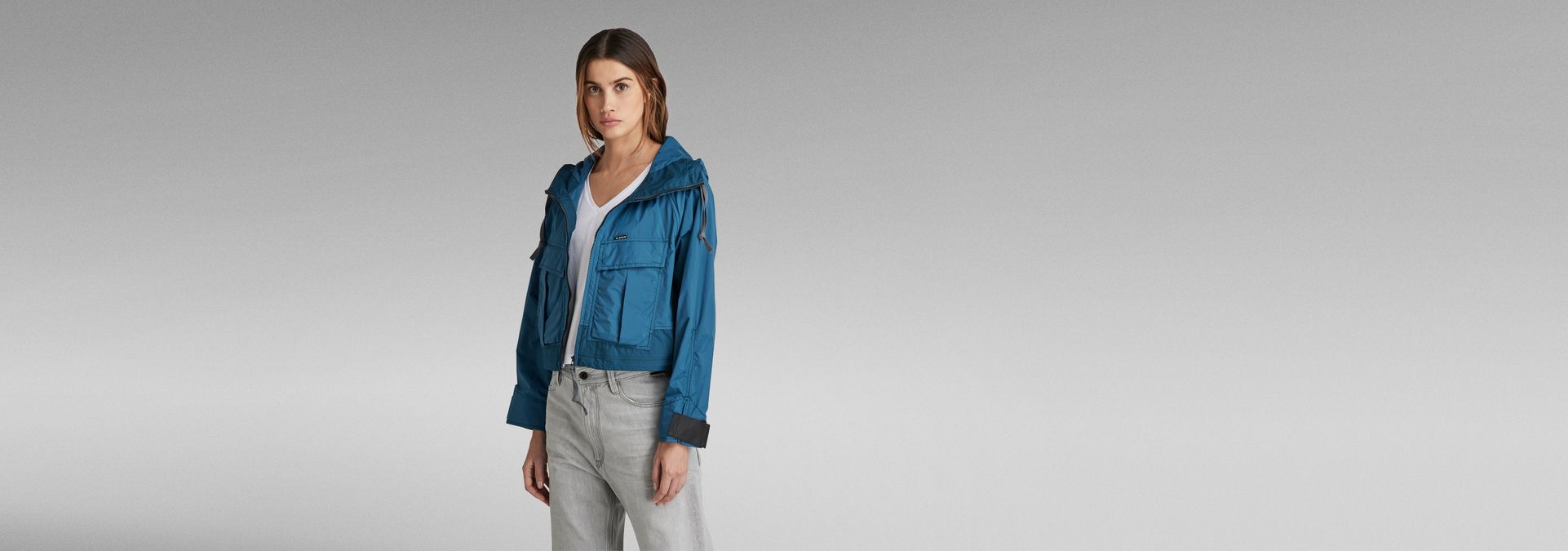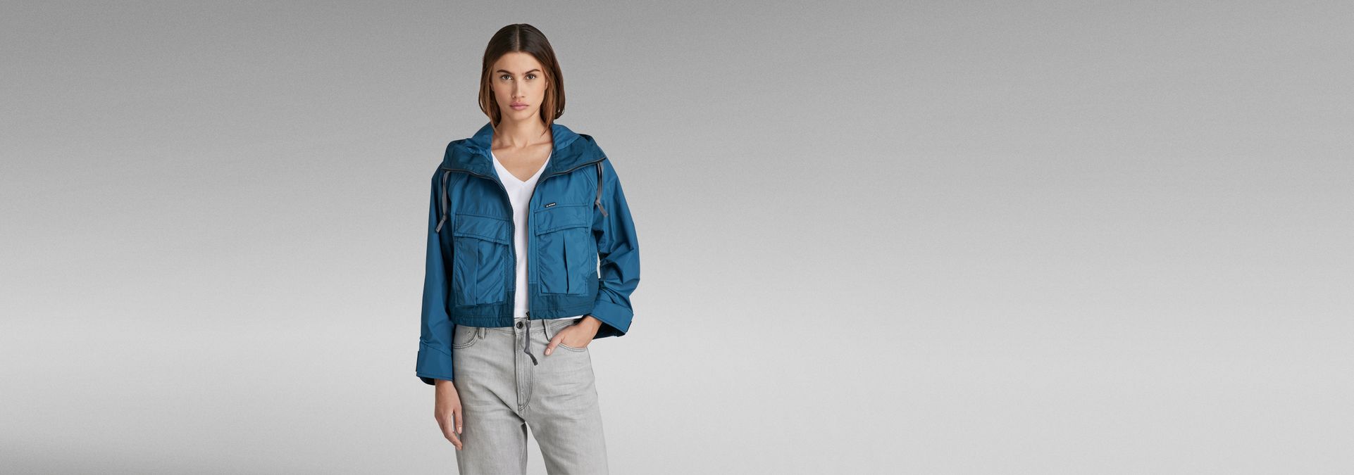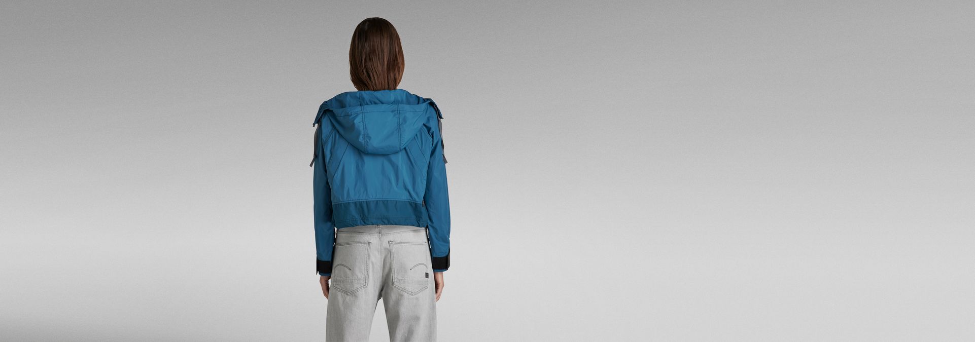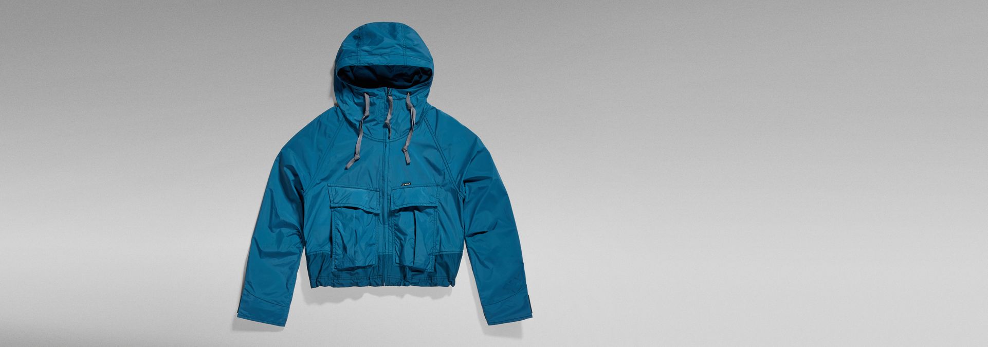 The Windbreaker jacket is designed in a cropped length and offers a loose fit. The hood shows a raised front and flat drawstrings. This short jacket offers deep front pockets with an additional side entry pocket underneath. The width of the waist can be reduced with the elasticated drawcord. When pulled, a more voluminous look is created. At the inside, woven tapes are placed diagonally and offer a loop at the back neck. The long sleeves can be tightened around the wrist by the Velcro applied.