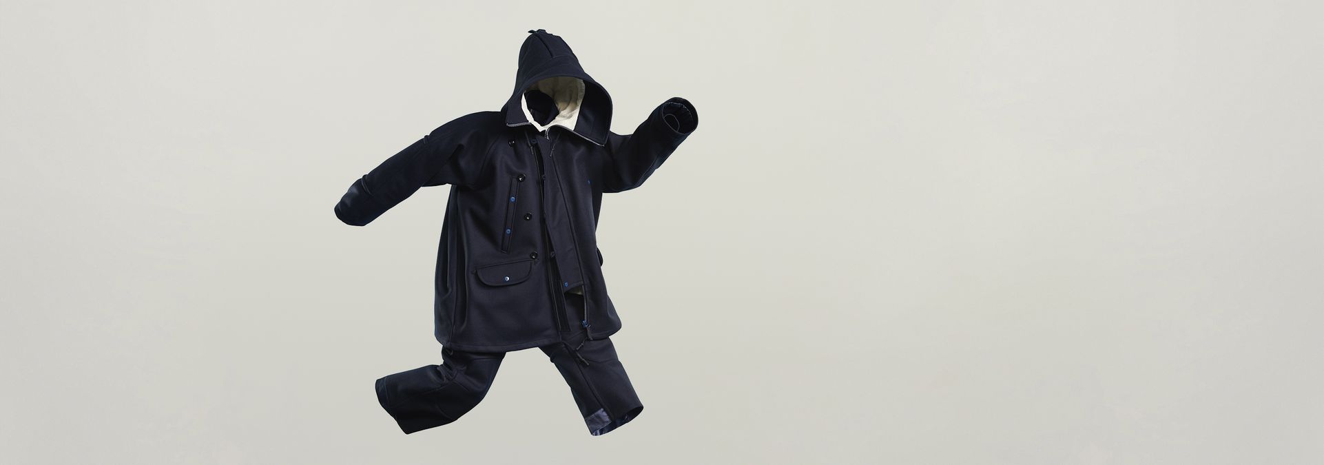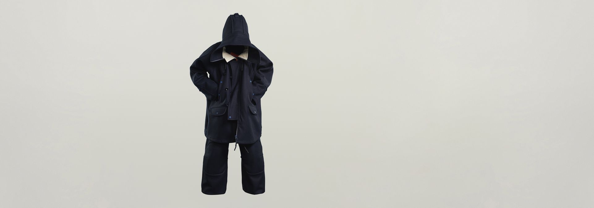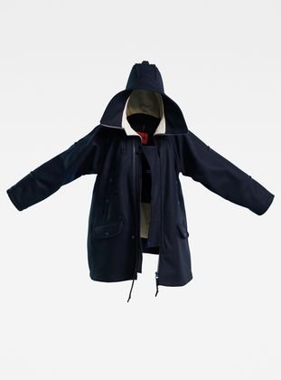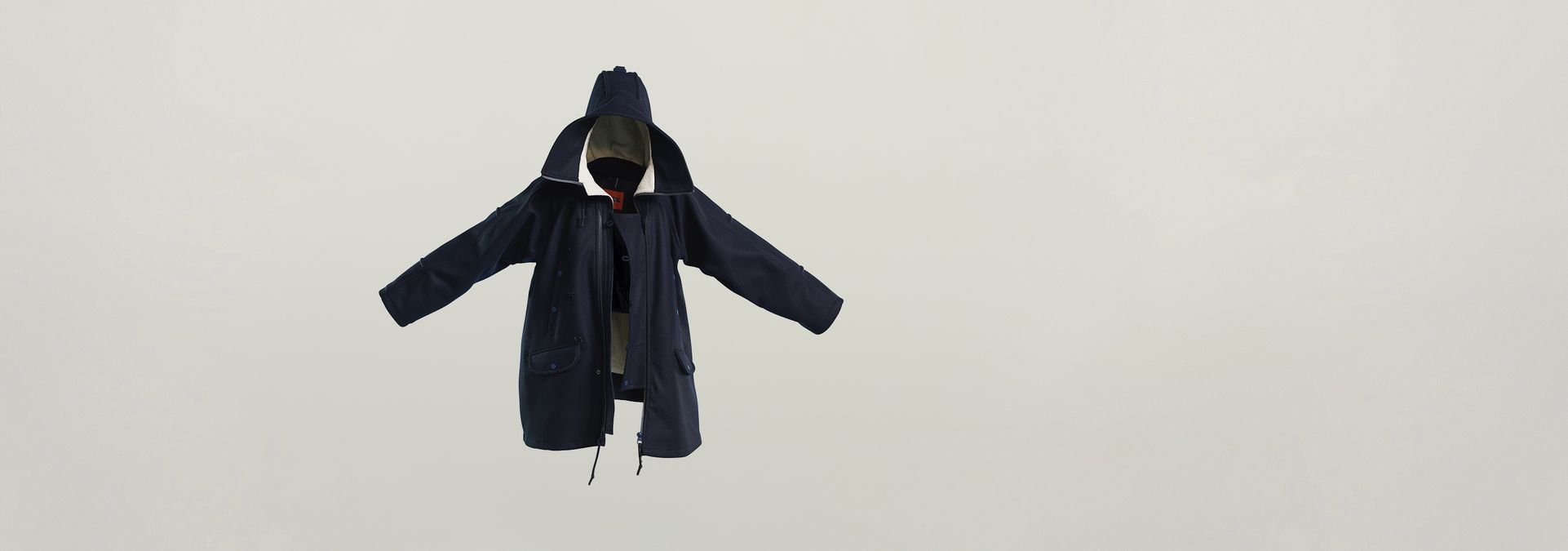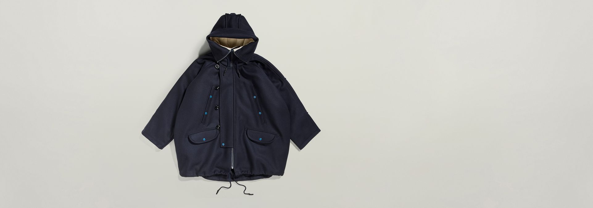 Parka Volume E is part of the Extremes collection, where timeless pieces are created by merging innovation with craftsmanship. The design shows a hooded jacket with a raised front and an extended peak. The woven tape on top offers adjustability to this constructed hood. This jacket shows roomy front pockets and single welt chest pockets above. Also inside a pocket is created. The pleats at the upper back, combined with an adjustable cord at the waist, create volume.