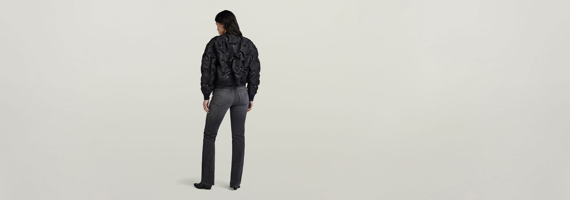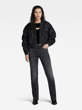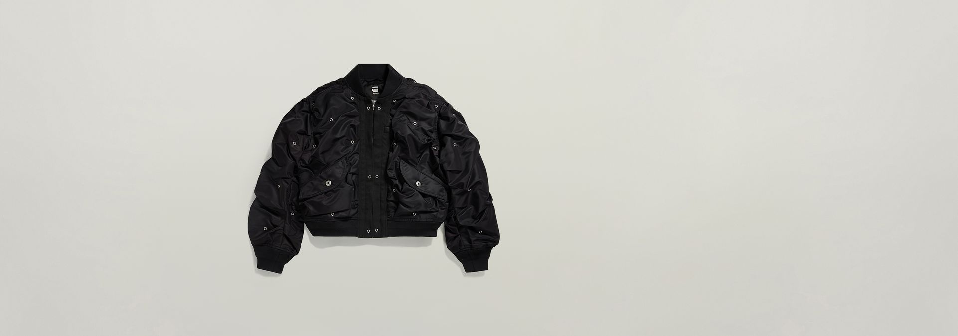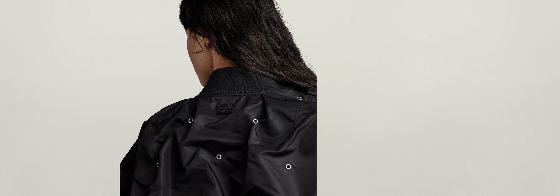 The Cropped Party Bomber is designed in a straight fit, cut in a shortened length. It is fully lined and padded with an additional layer. A 3D-effect is created by fixating the volume with ring snaps throughout this bomber jacket. Flap pockets with a button closure are placed at the waist. For ease, a hanger loop is added inside.