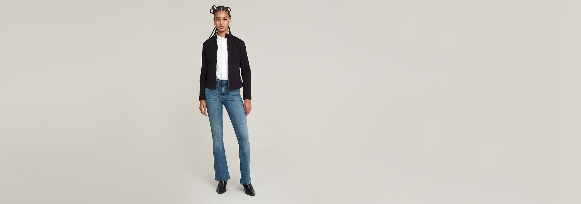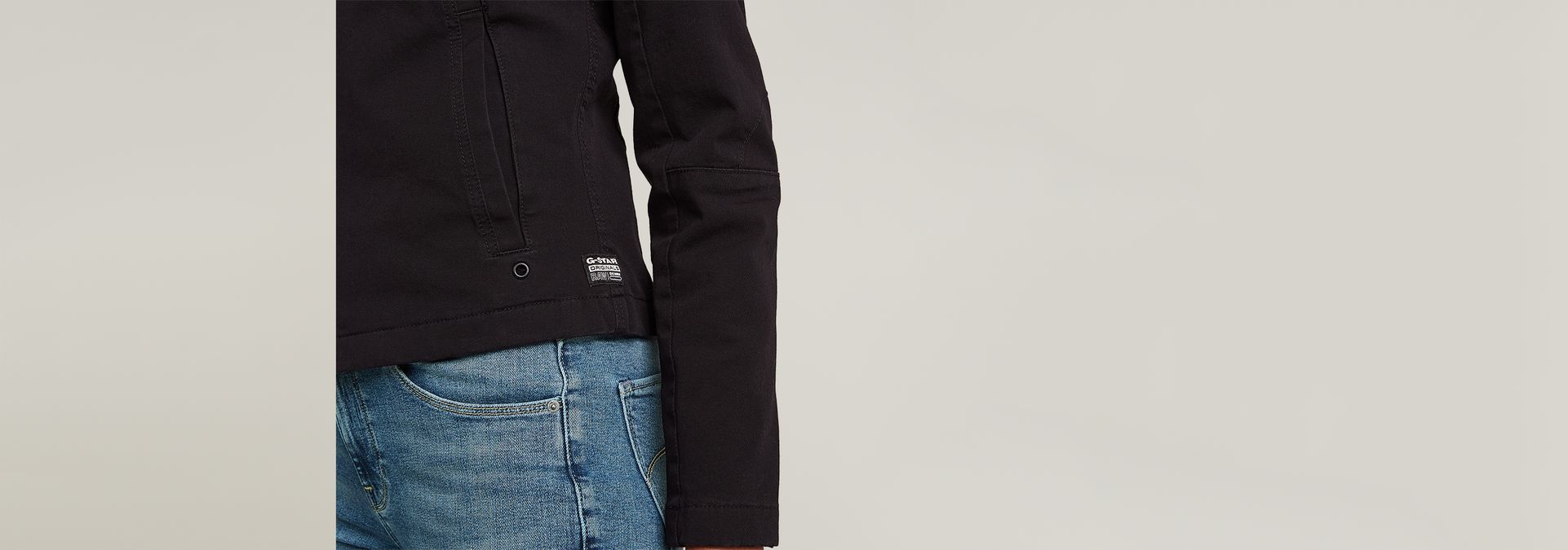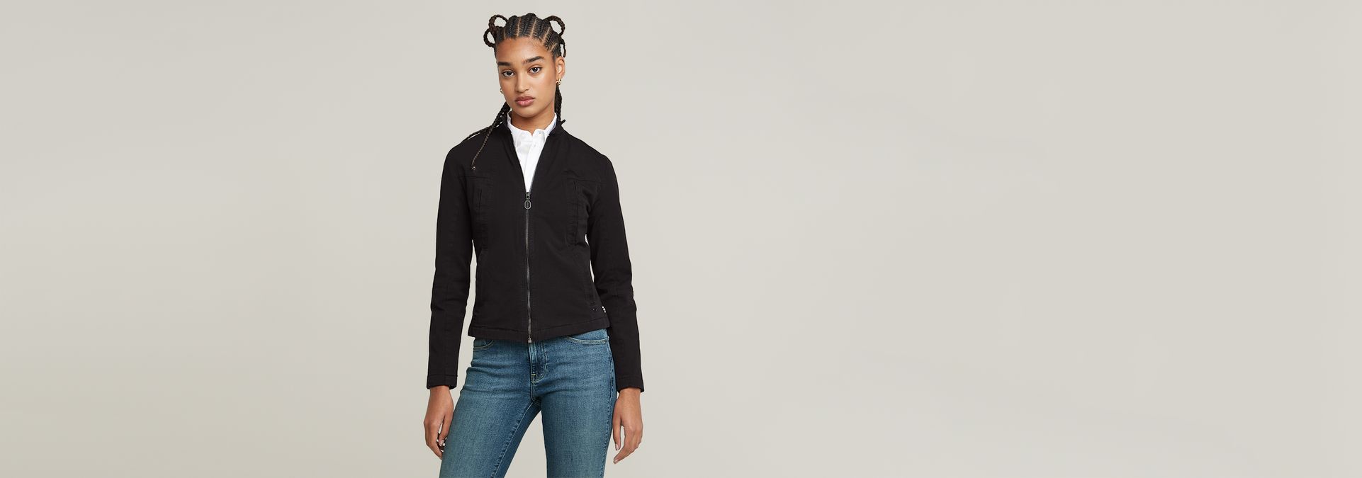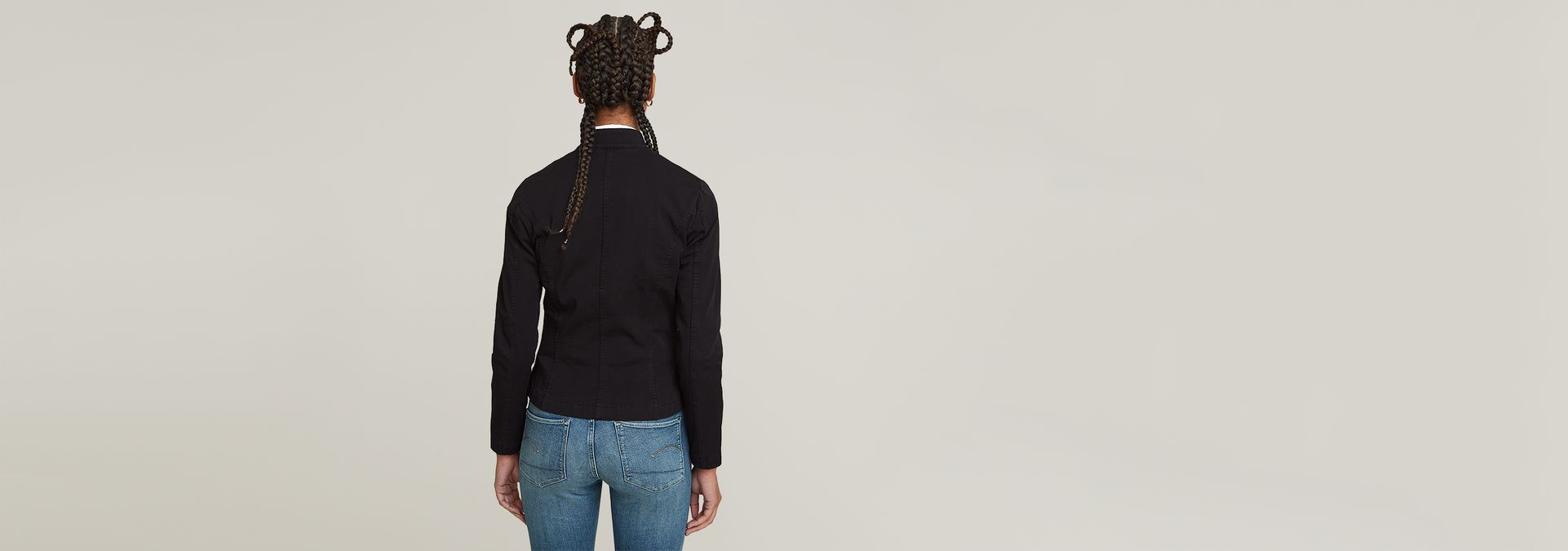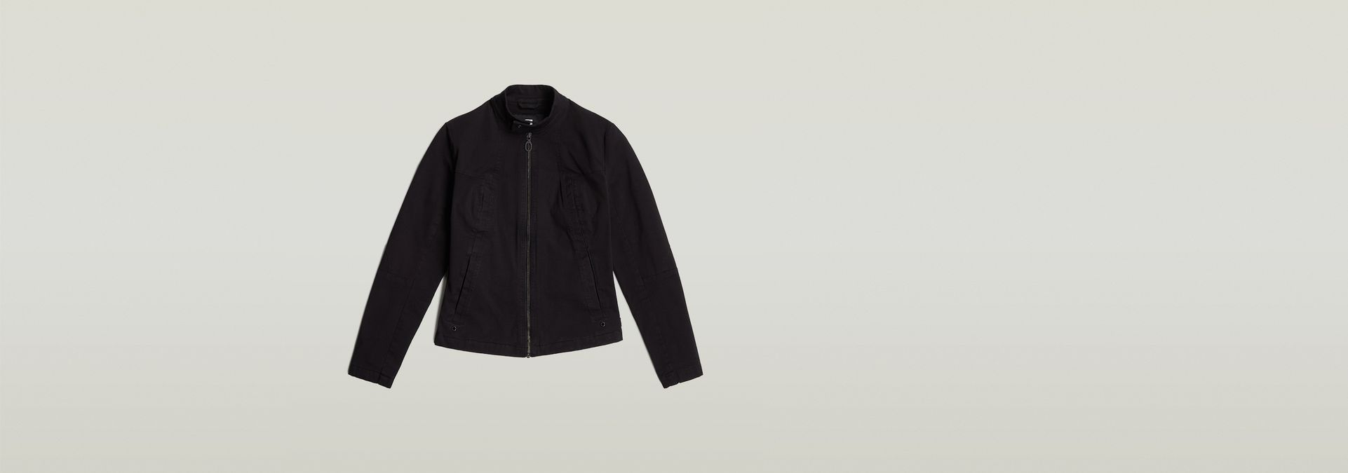 This zip thru biker jacket is cut in a shorter length and offers a superslim fit. The band collar is finished with a snap button and welt pockets are added to the waist. This stretch denim jacket is fully lined.