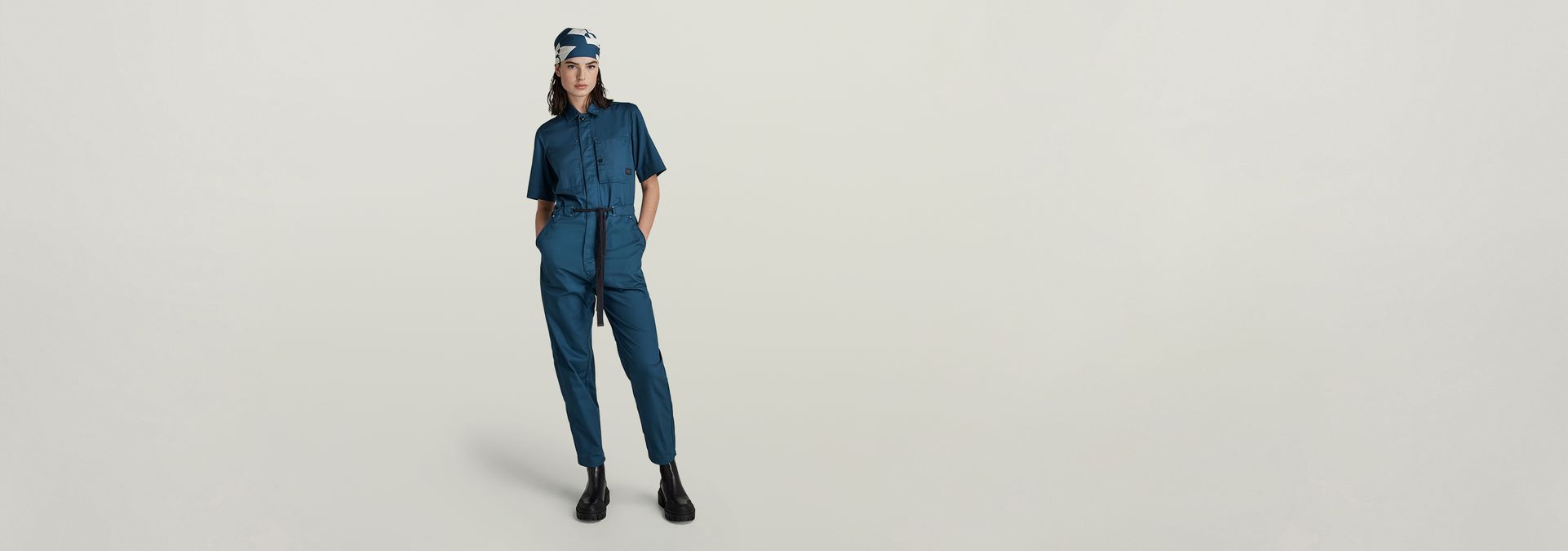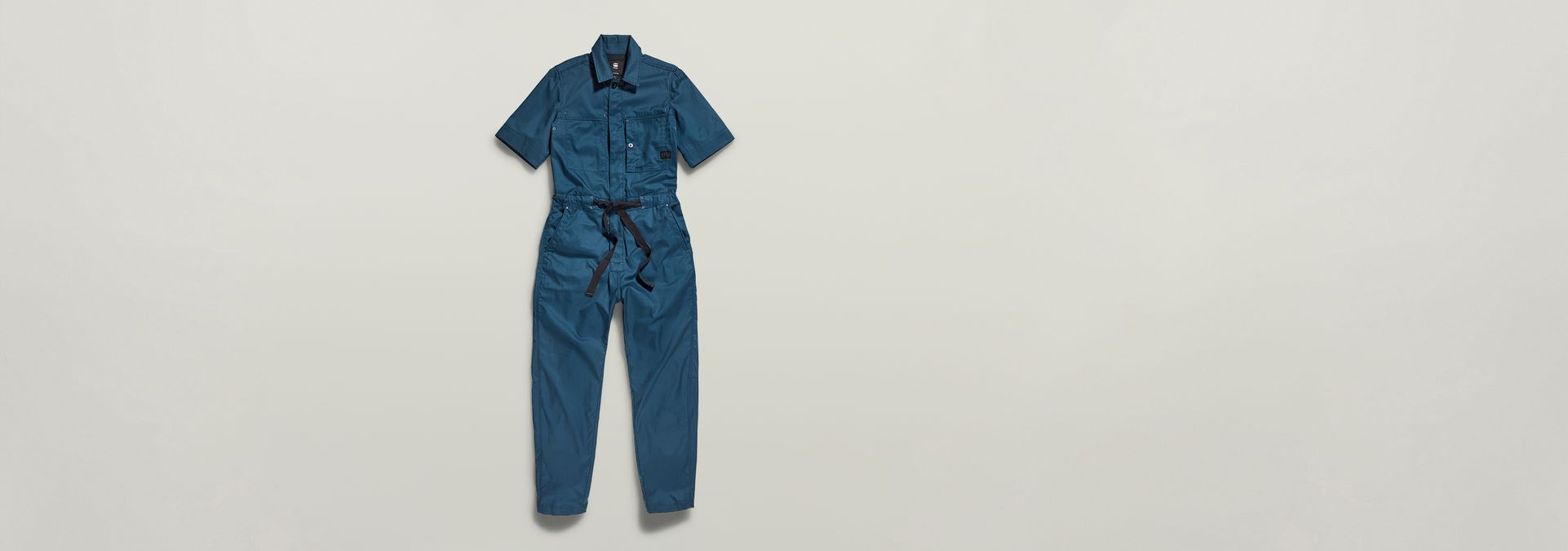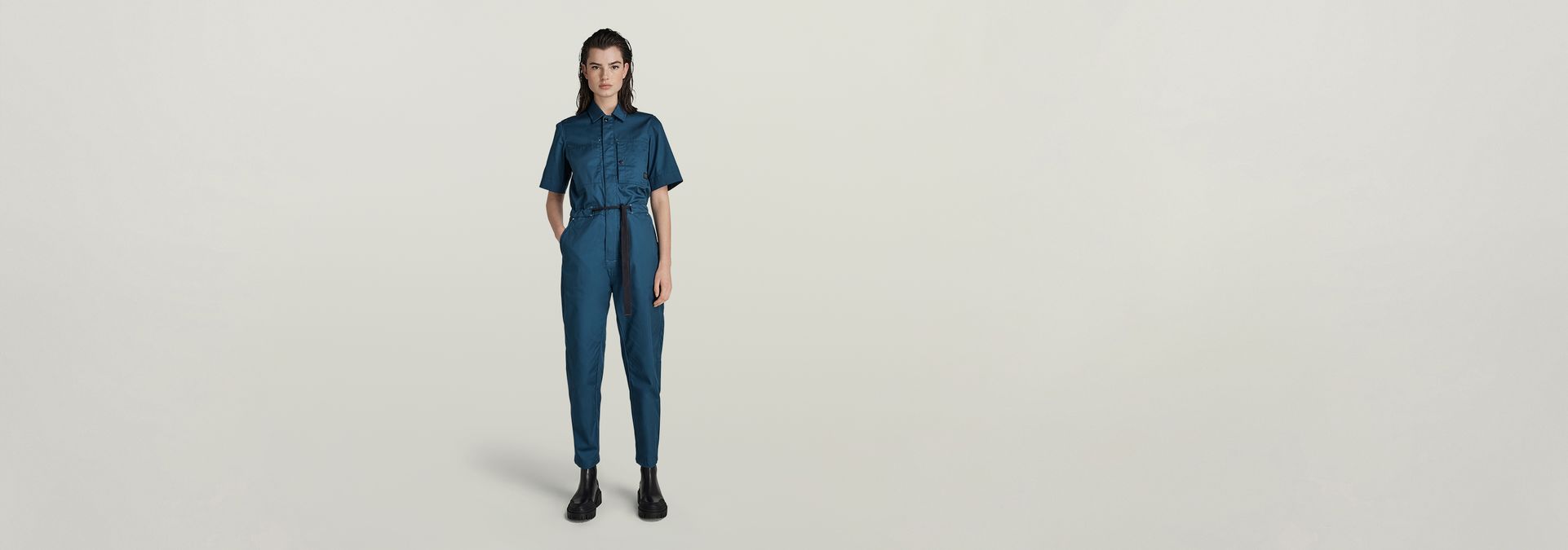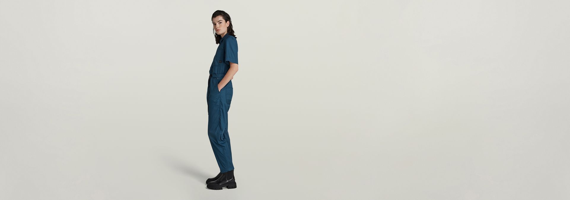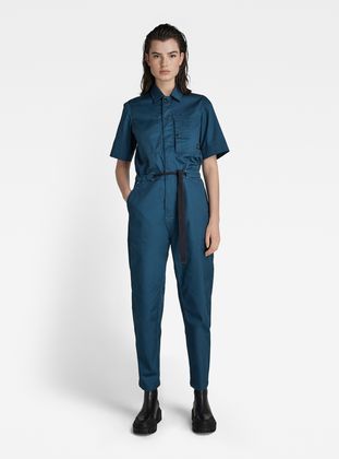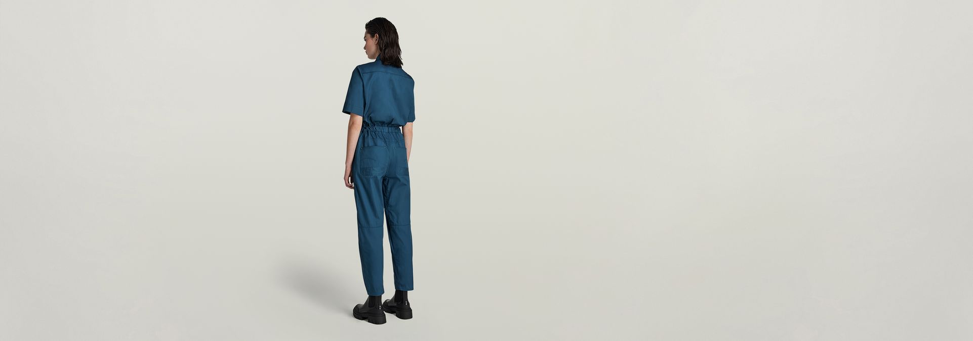Jumpsuit Army is designed in a straight fit and offers a hidden snap front closure. An elasticated waist is combined with a tape drawstring at the front. Semi short sleeves allow for a fold over option. This overall shows many pockets. A single side entry pocket at the chest is combined with a hidden pocket at the opposite side. Waist pockets are finished with a slim piping and the back shows patch pockets. The straight fit of this jumpsuit can be slimmed by the woven drawstrings at the waist.