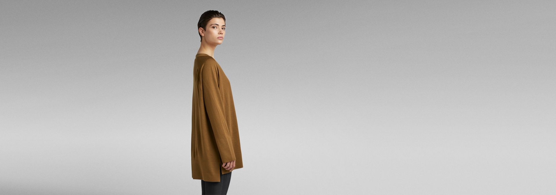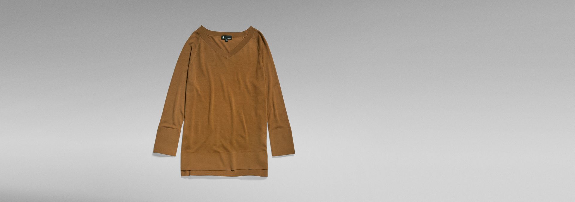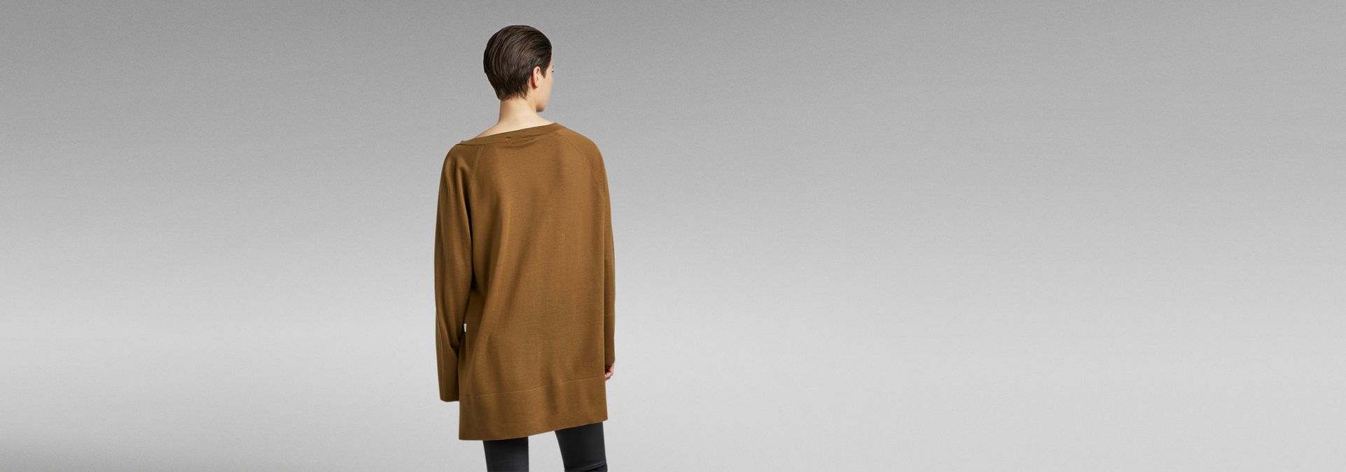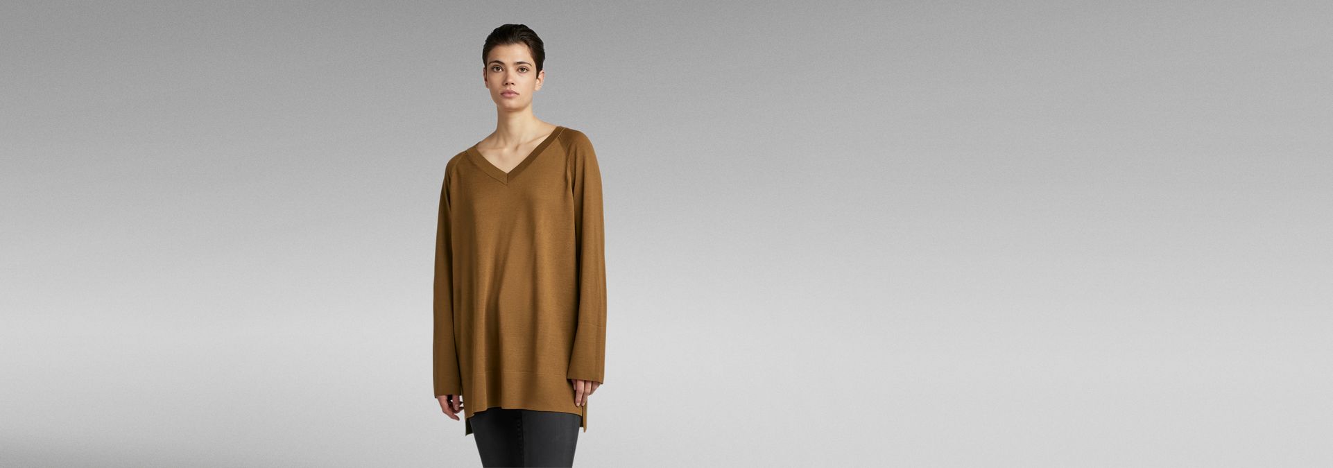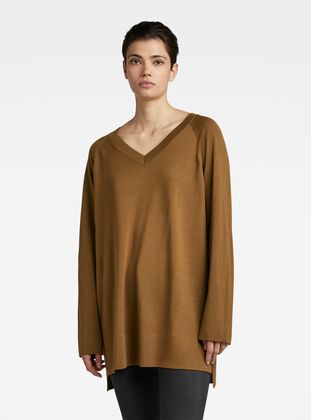 Knitted sweater V-Neck is designed in a roomy, oversized fit. Slits are added to the sides where the back panel is kept slightly longer than the front. The ribbed edge creates a comfortable finish of the raglan sleeves and waist.