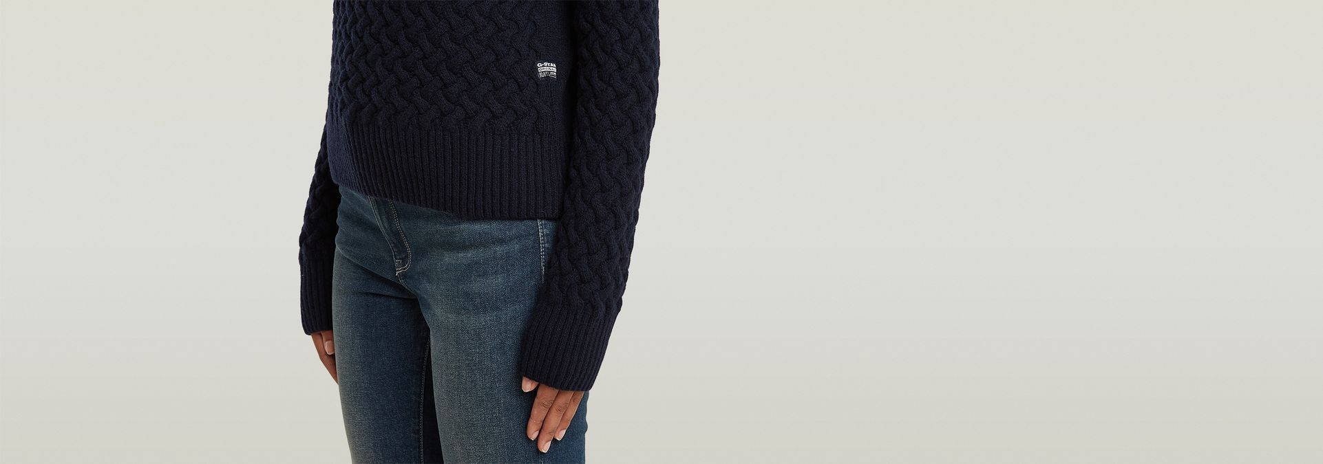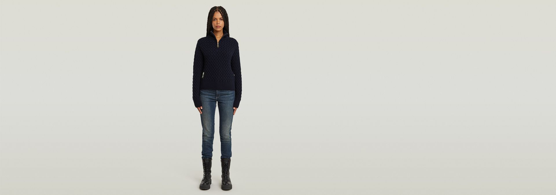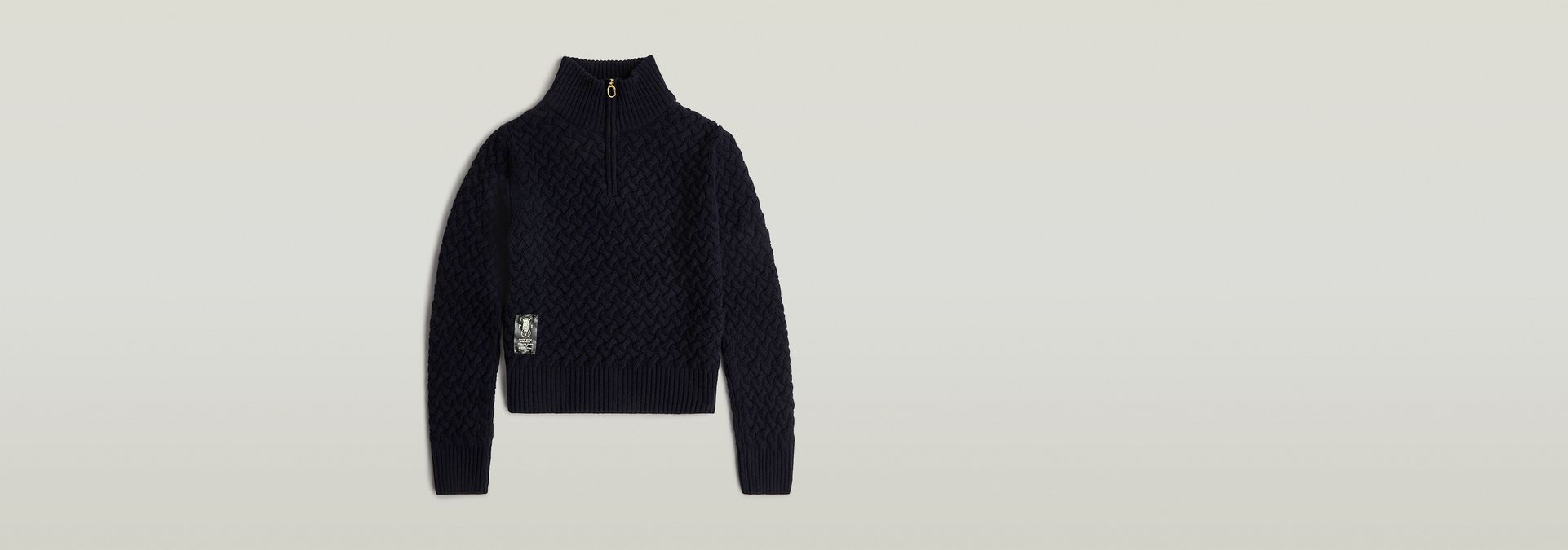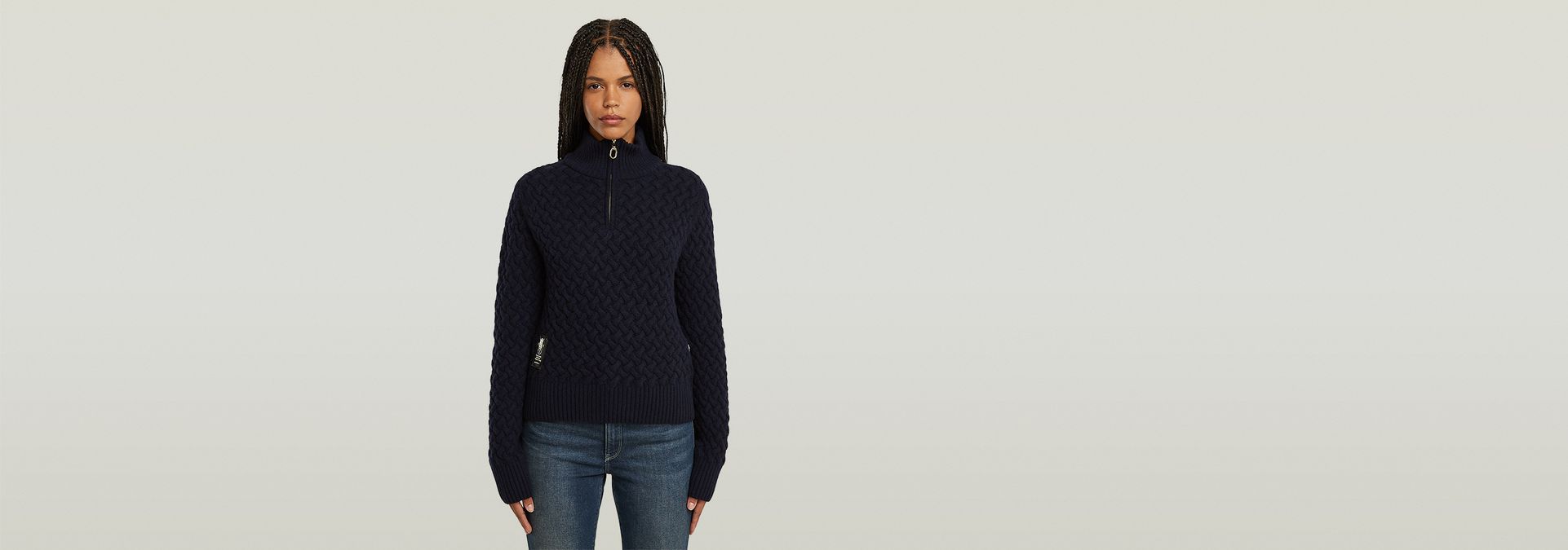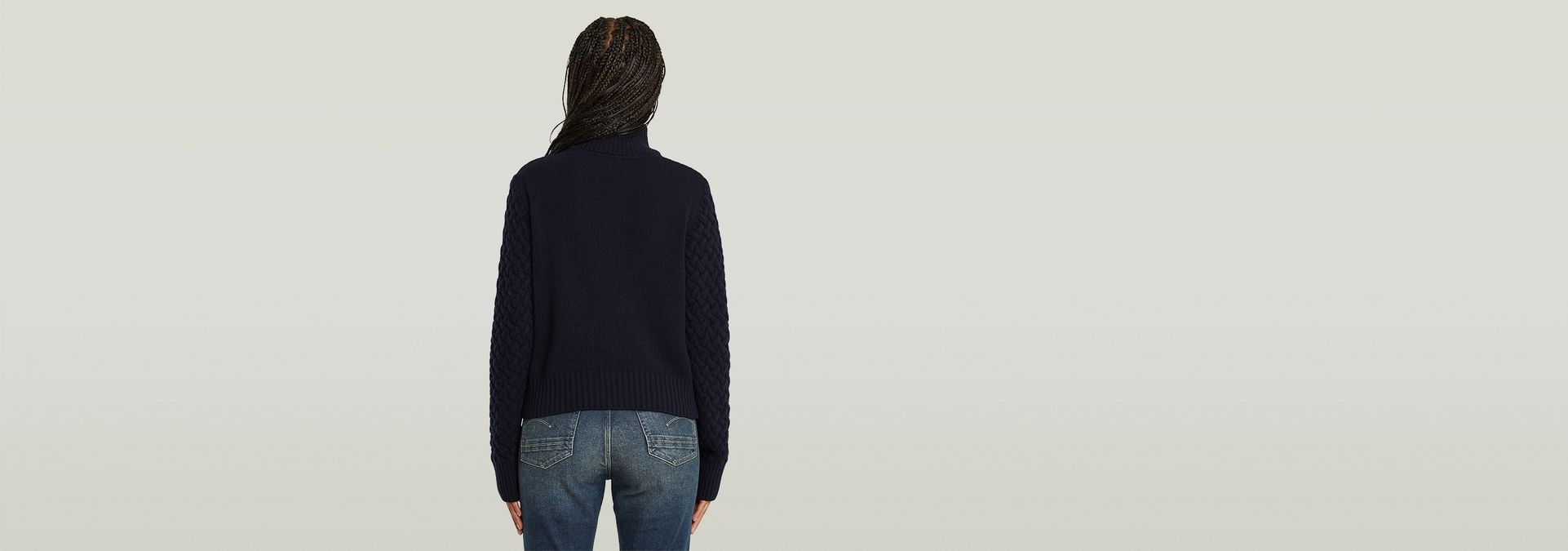 Skipper Chunky Knit is designed in a straight fit and offers a cropped length. A short zipper is added to the raised collar to allow for a wide spread collar if preferred.