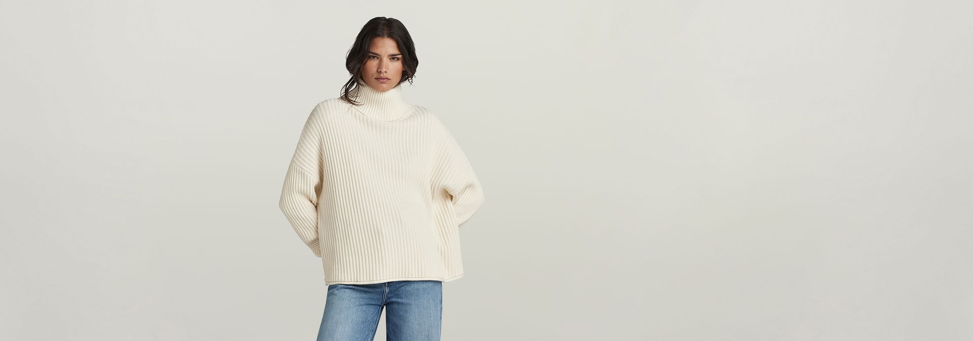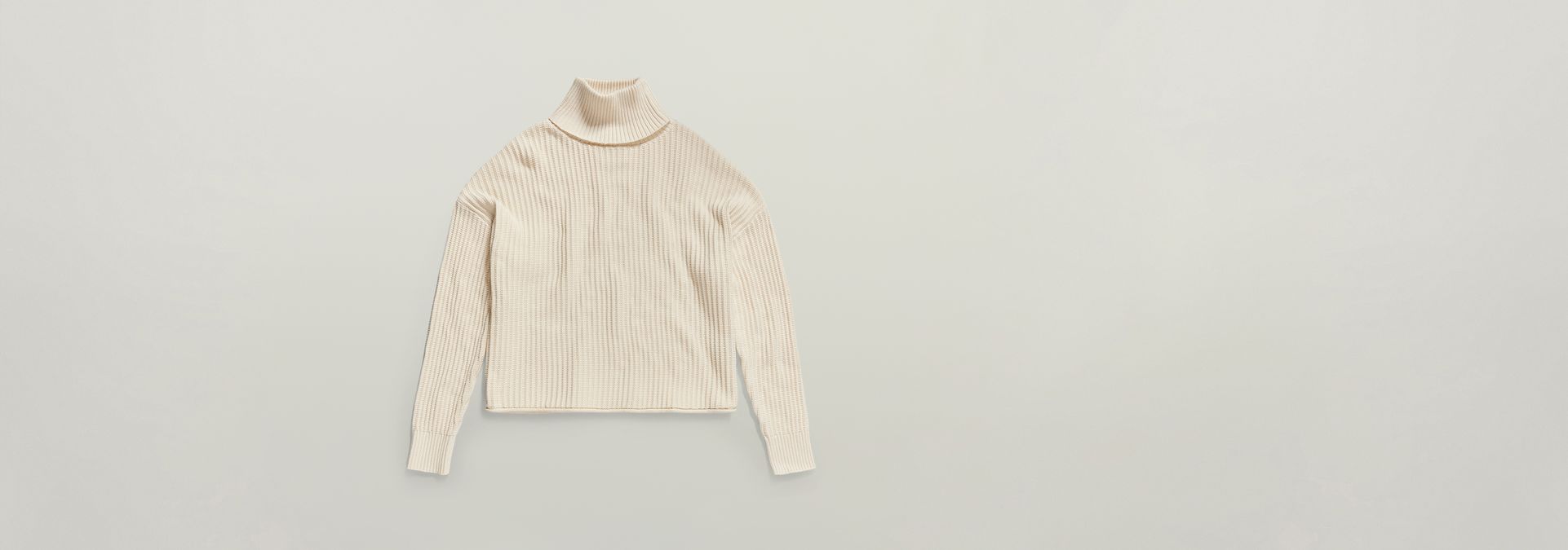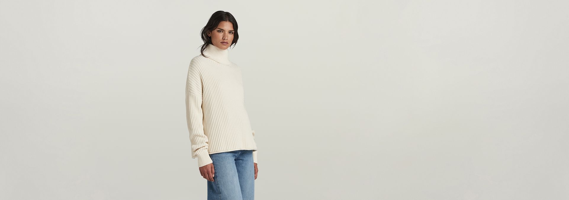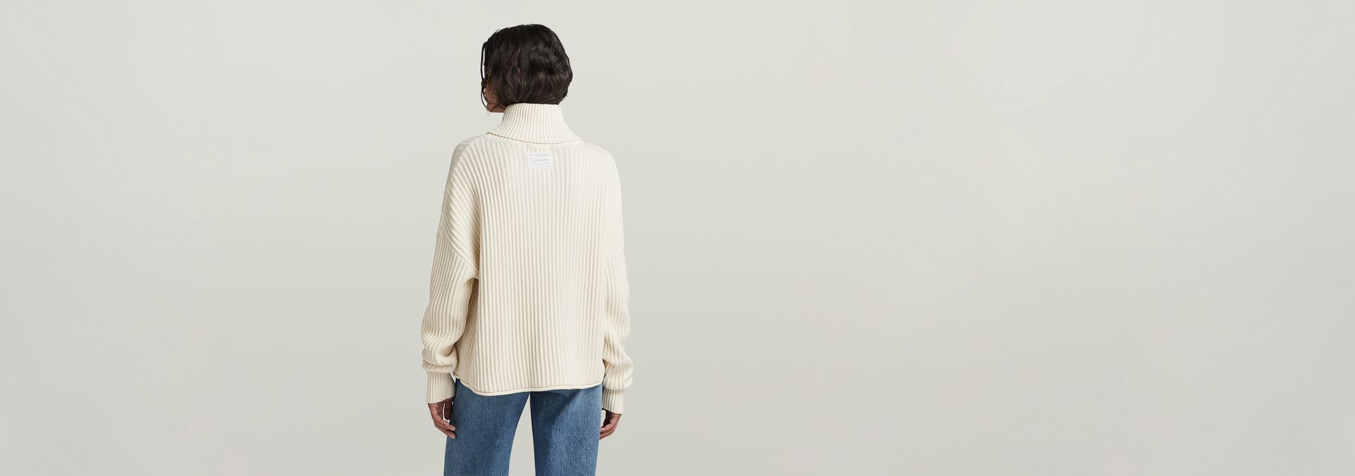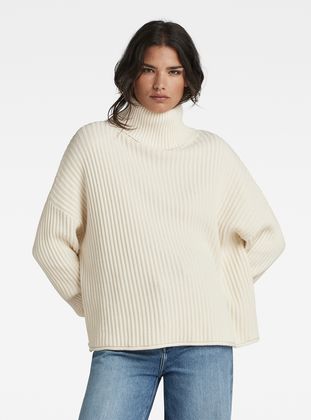 Knitted turtleneck sweater Loose is designed in a ribbed structure and offers a roomy fit. The heavy collar adds a comfortable finish.