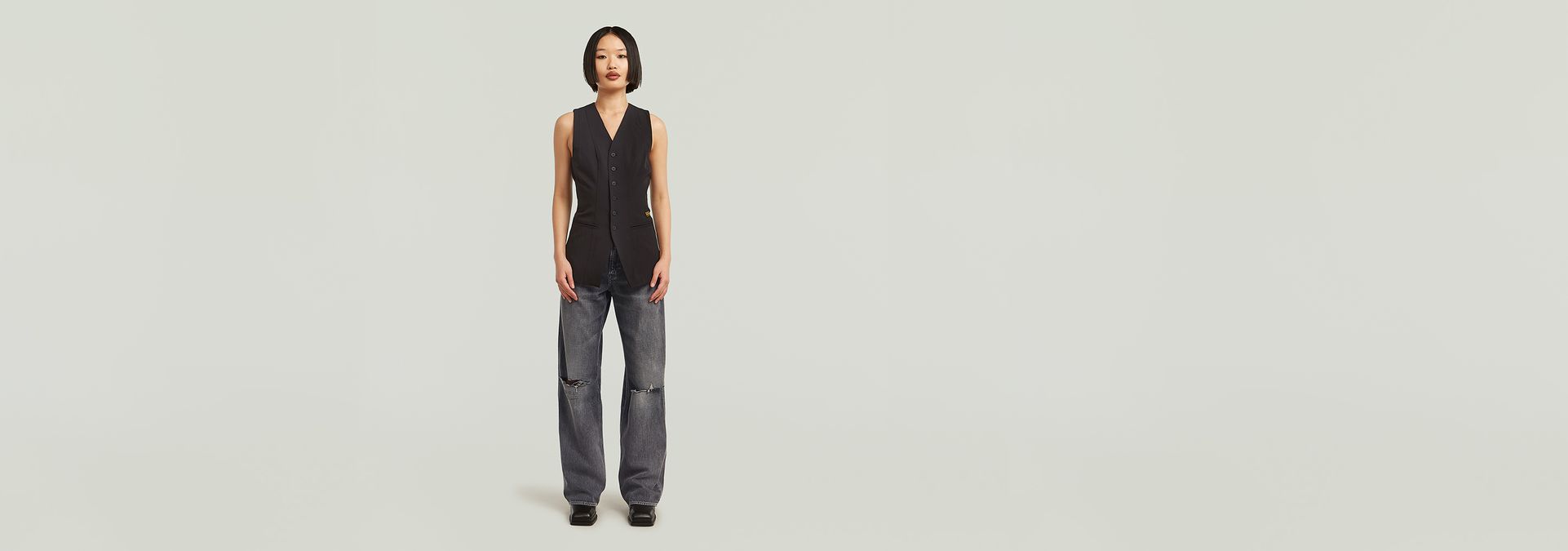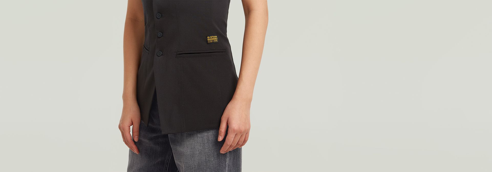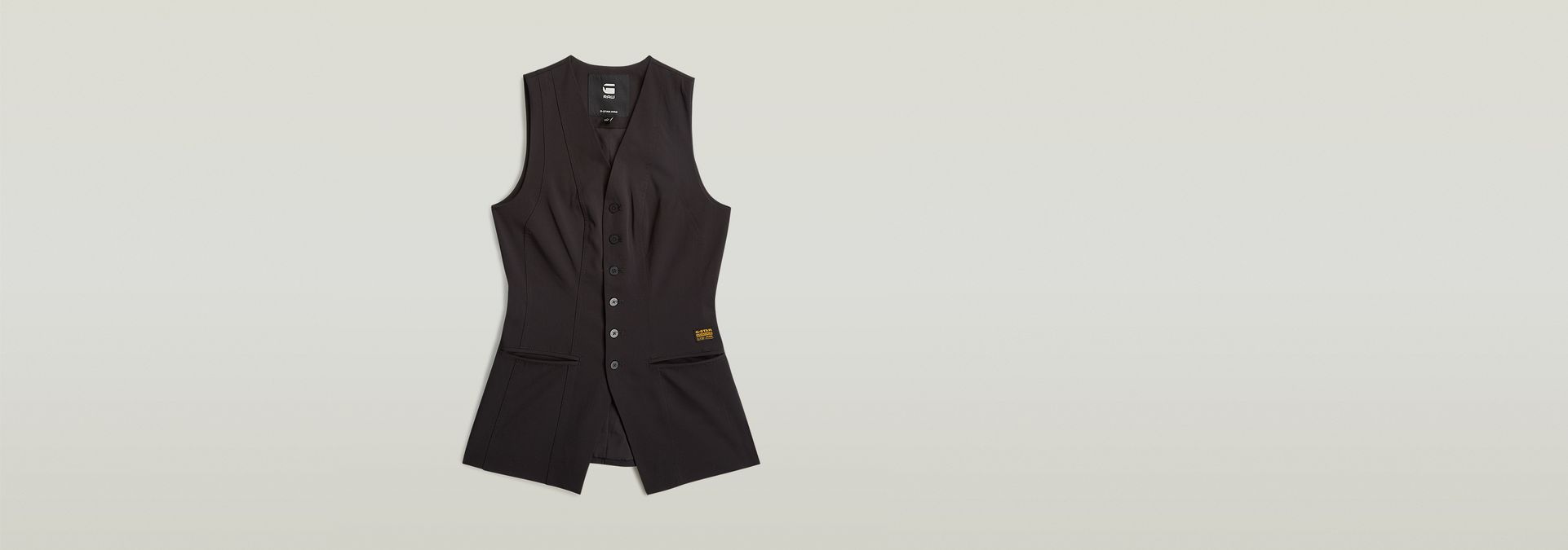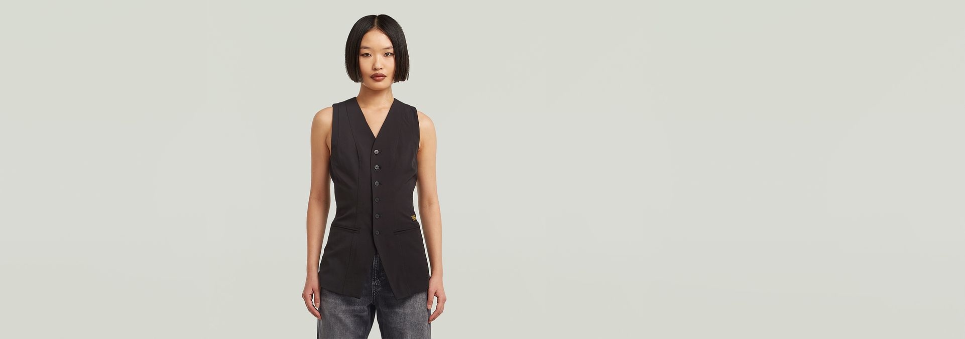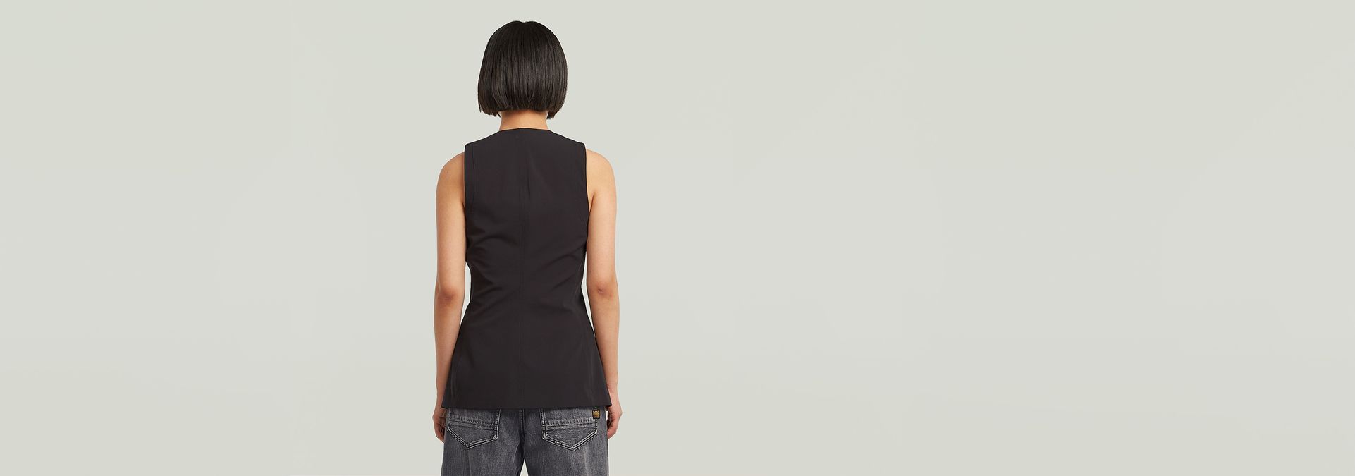 The Waistcoat Top offers a slim fit with a button closure. Its sleeveless design provides a sleek appearance.