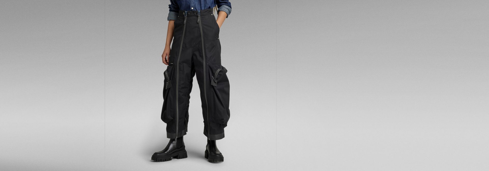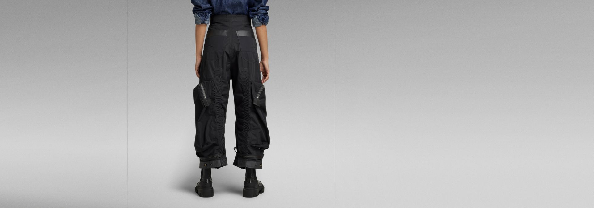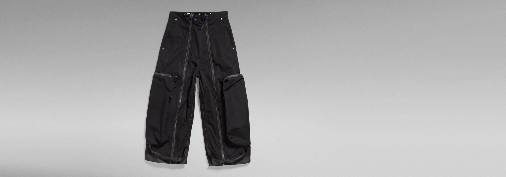 - Inset pocket, back pockets and oversized zip pockets at the lower legs