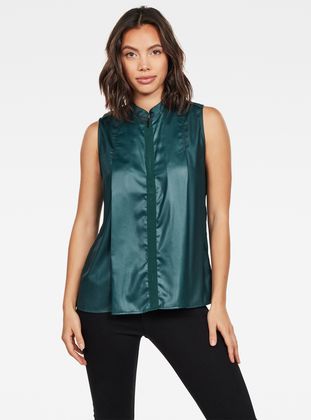 The Road shirt is a sleeveless top with a small band collar. A concealed zipper is set behind woven tape welts. At the shoulder epaulettes are added, giving a small military touch.