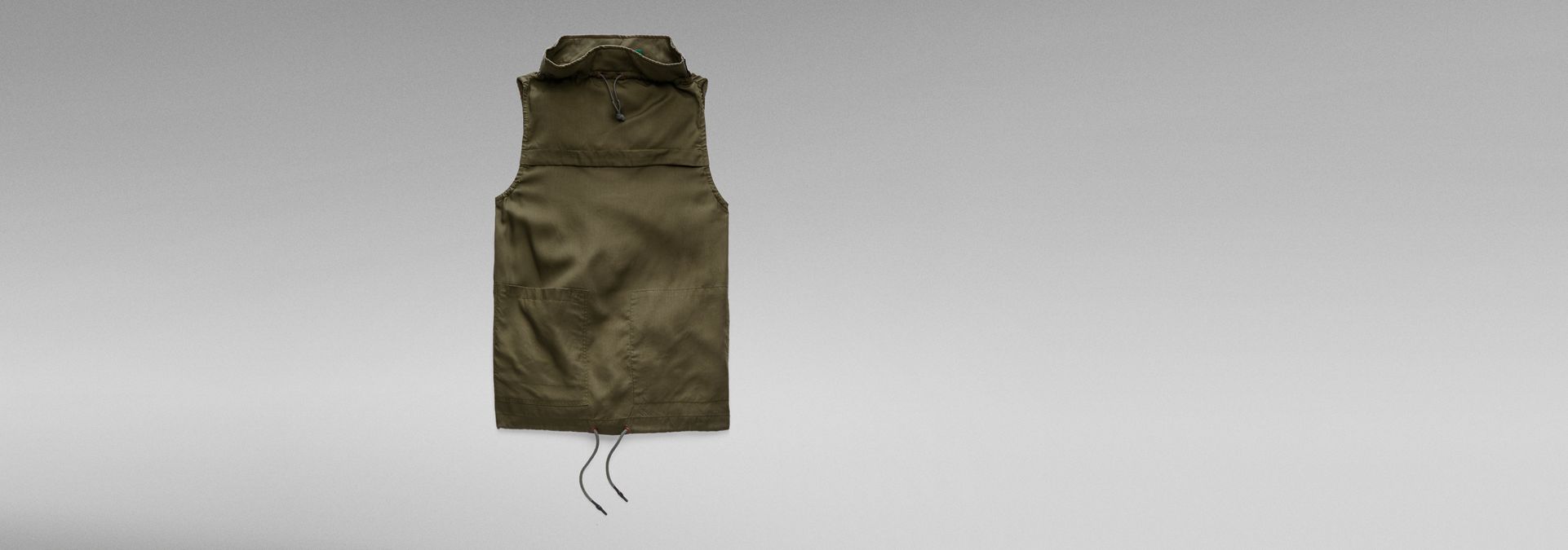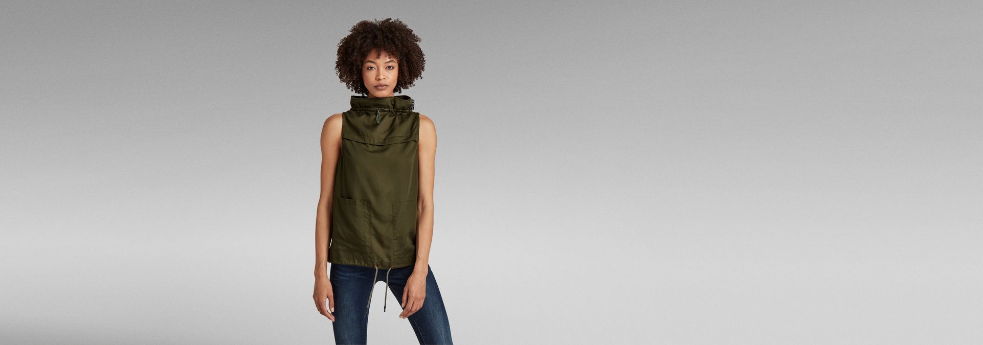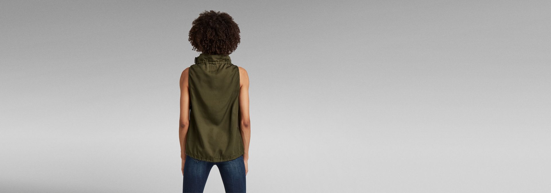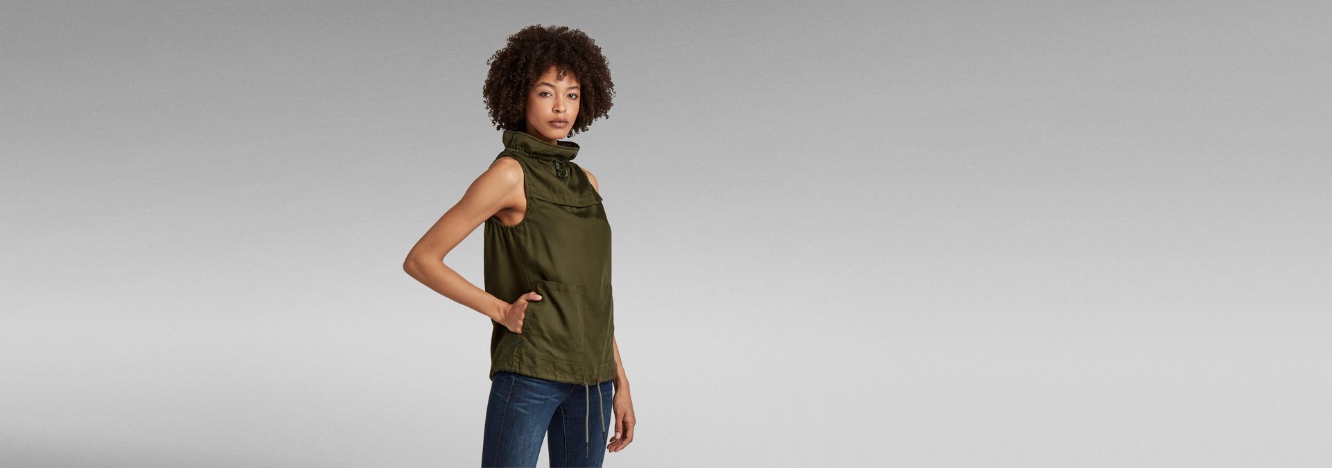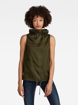 The Sleeveless Mock Neck Top is defined by it’s statement high neck and elasticated armholes. The drawcord added to the straight hem can create more volume when tightened. Another pull cord is added to the raised neckline. This top offers flexibility and ease of movement while adding eye for detail. Patch pockets at the front offer an additional pocket that is accessible from the top.