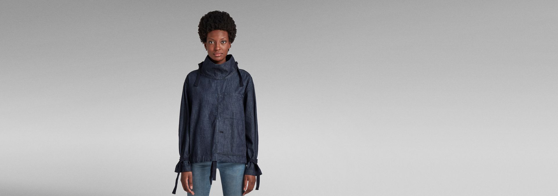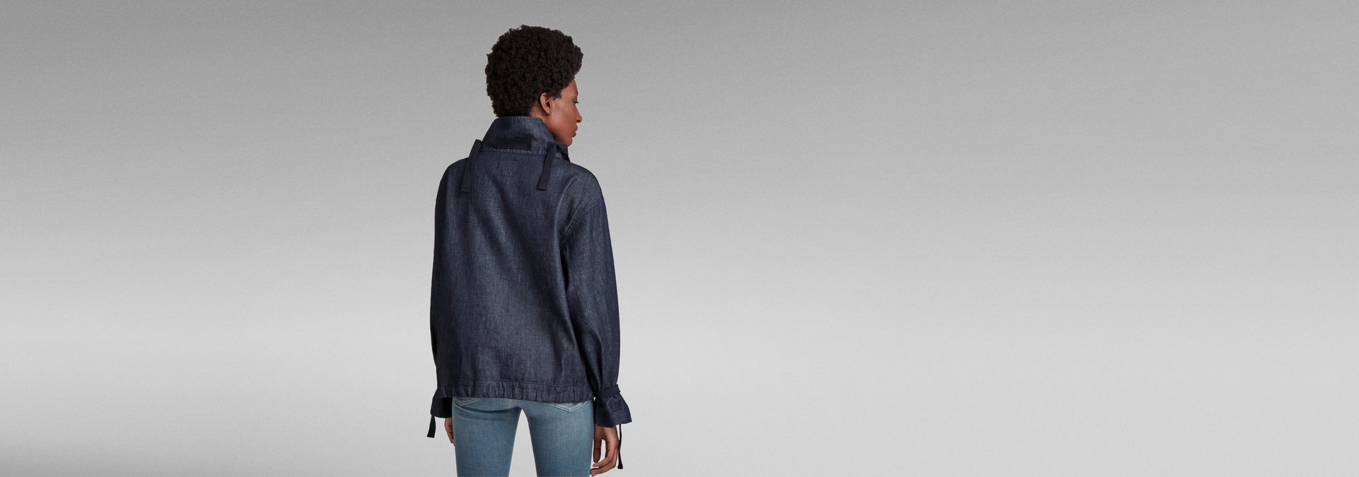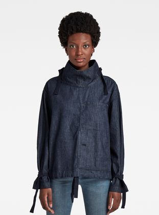 Shirt Mock Neck is defined by it’s statement high neck and roomy sleeves. The woven tape added to the straight hem can create more volume when tightened. Another tape is added to the back neck. This naval inspired top offers a patch pocket at the front with an additional pocket that is accessible from the top. The woven tapes applied to the sleeves offer a loop. This way the tape can be pulled through to create a gathered cuff.