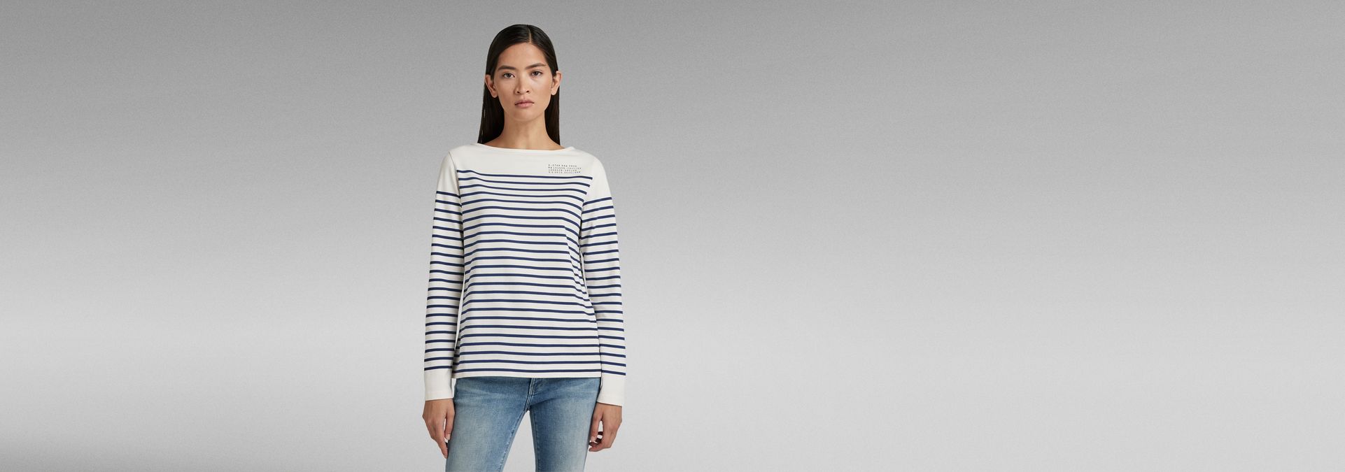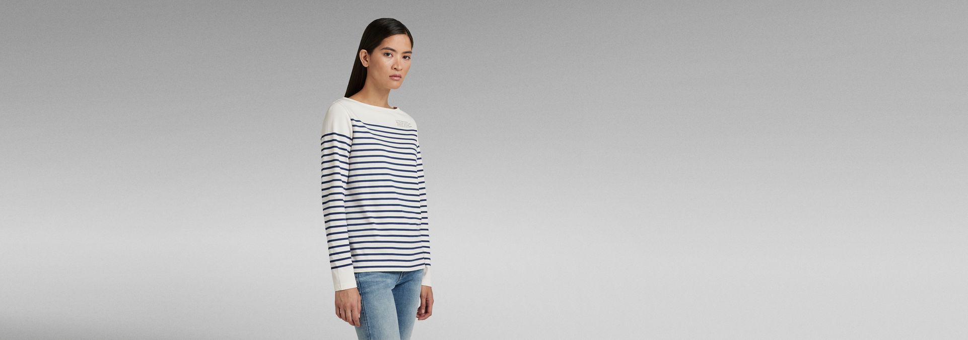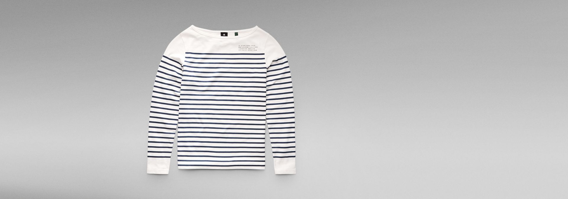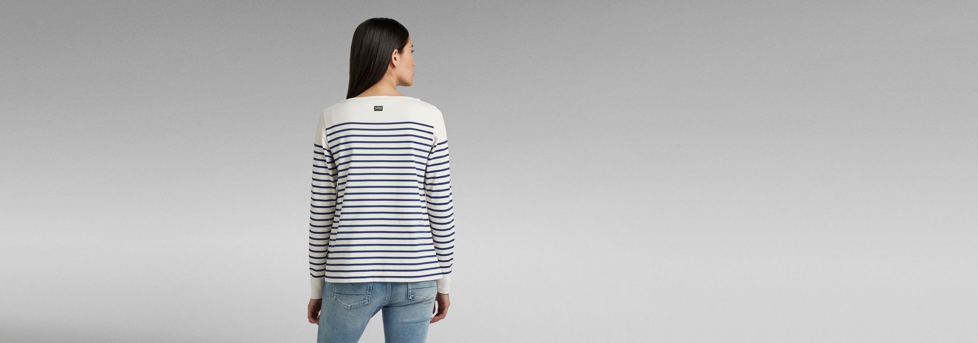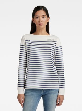 Jersey sweater Stripe Graphic offers a boat neck with a slim rib binding. The horizontal stripe repeat proceeds towards the sleeves. The graphic print at the chest completes it.