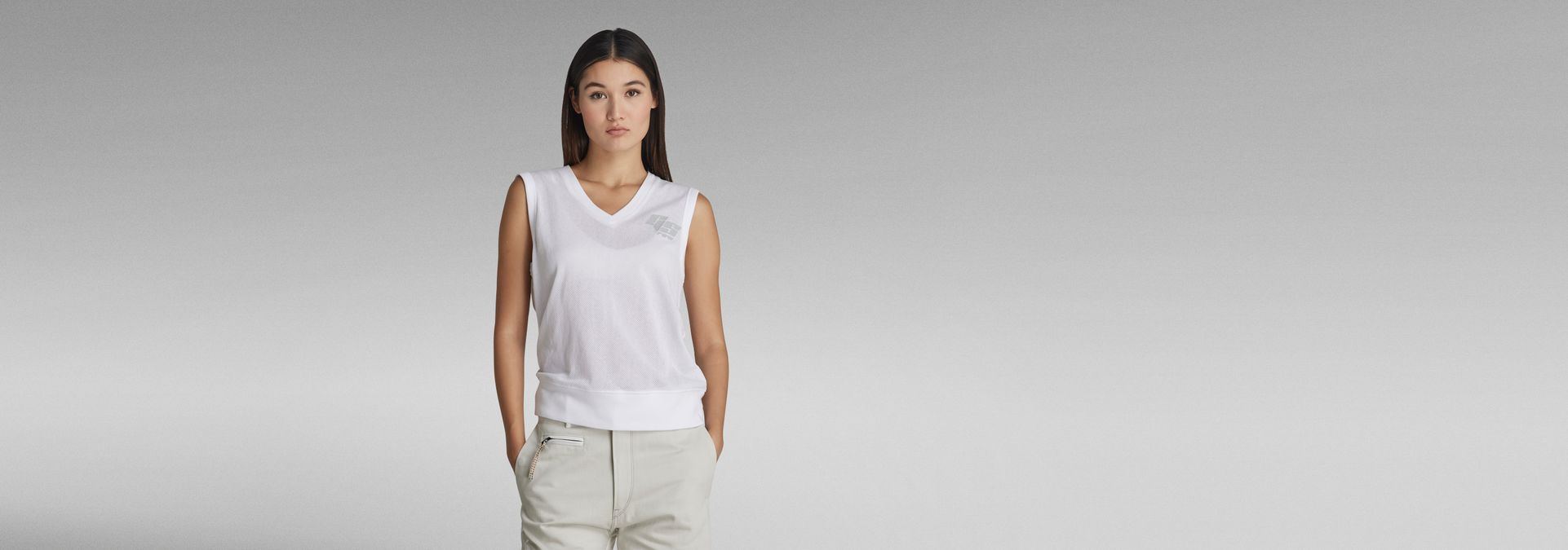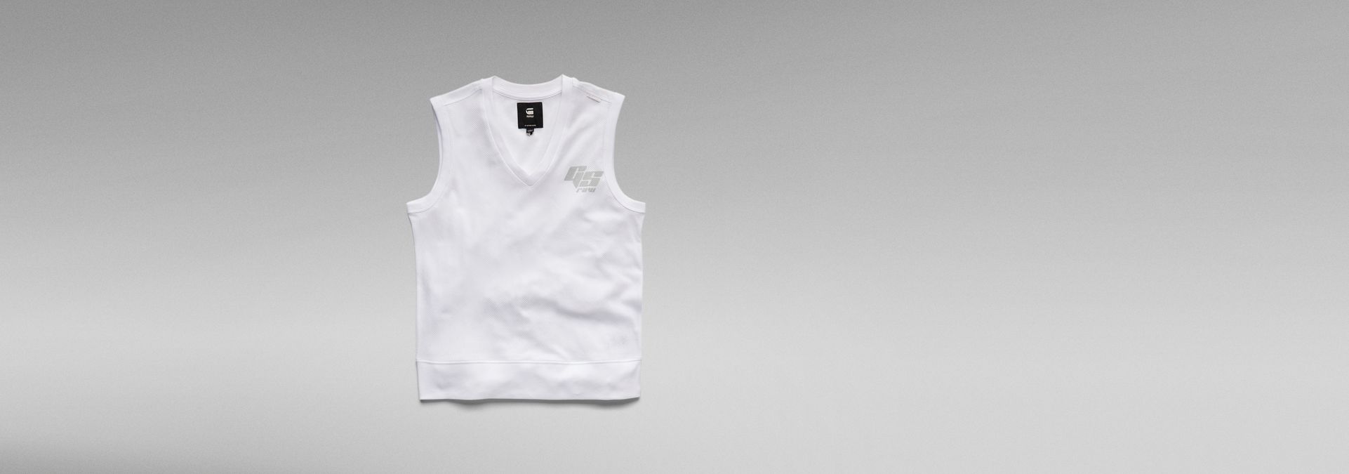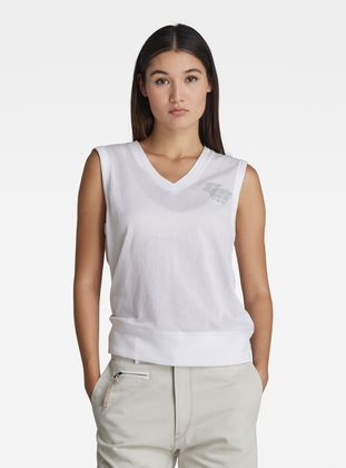 Tank top Sports Graphic Mesh offers a loose fit in a semi-transparent aesthetic. Ribbed edges are applied along the V-neck, armholes and waist. The graphic print at the chest completes it.