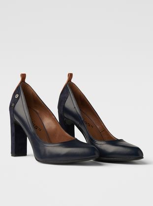 Leather heels with fine suede accents and slim block heels. Rivet details and a small ankle puller accent the upper. The fine rubber sole is finished with a ripple pattern.