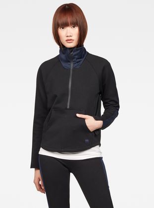 This Zip Sweater is designed with a high collar. The sleeves are created with a shaped upper back shoulder panel that grows on to the sleeves. The sleeves show an extended length at the back and elastic cuff adjusters. By a simple foldover you can create a thighter cuff. The lower sleeve features a pocket for your phone, while the front offers a deep kangeroo pocket for eas.