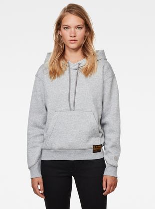 The Premium Core hooded sweater features a kangaroo pocket and a wide hood with drawstrings. Long sleeves have a curved finish, showing a ribbed cuff underneath. A subtle G-Star RAW logo is added to the lower sleeve.