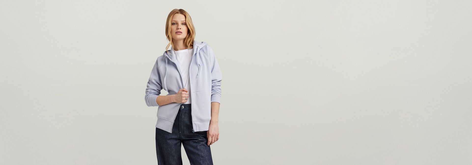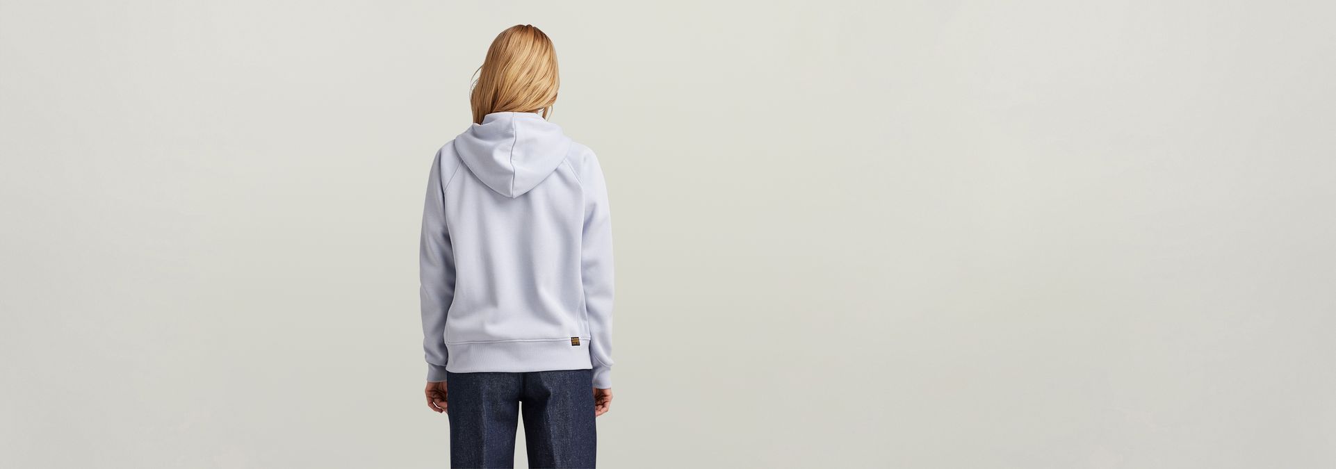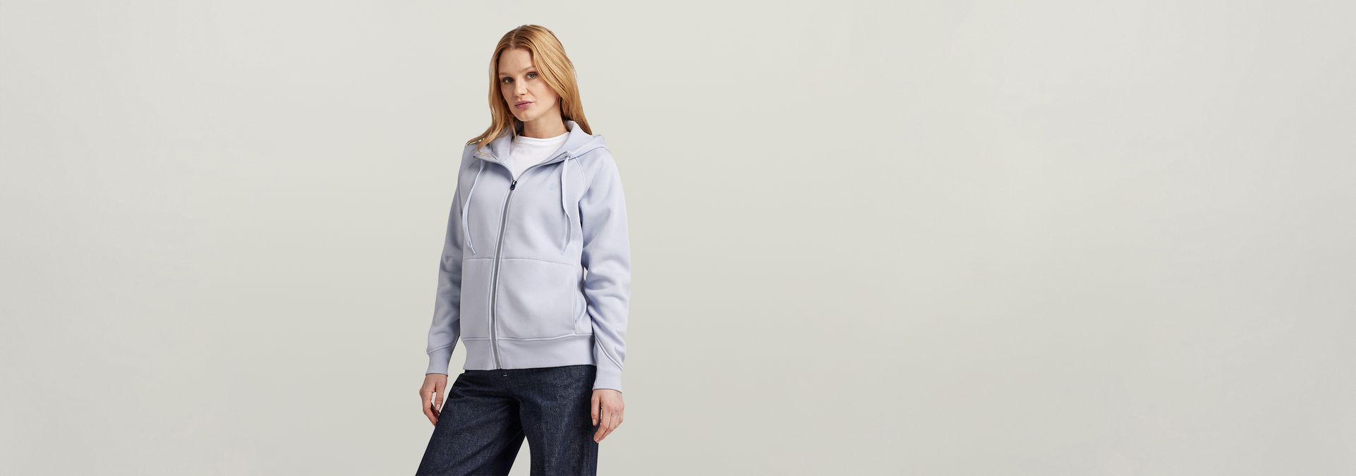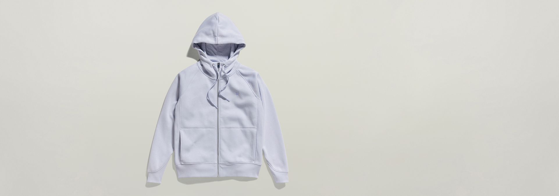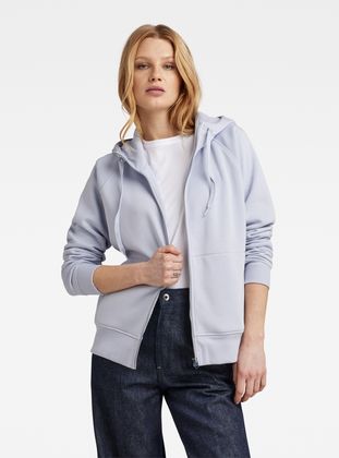 Hooded zip through sweater Premium Core 2.1 features a split kangaroo pocket and a hood with a raised front and drawstrings. The sleeves have a curved finish, showing a ribbed cuff underneath. The G-Star RAW embroidery at the chest signs this sweat jacket off.