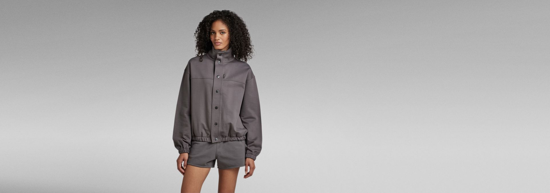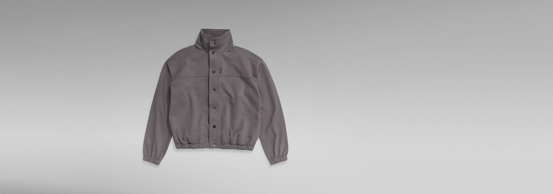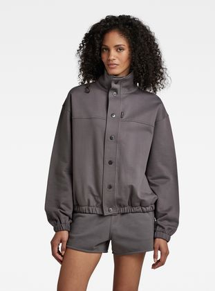 Sweater Windbreaker Loose offers a relaxed fit with a raised collar. A stretchable edge is added to the sleeves and waist. This sweater jacket shows a snap button closure.