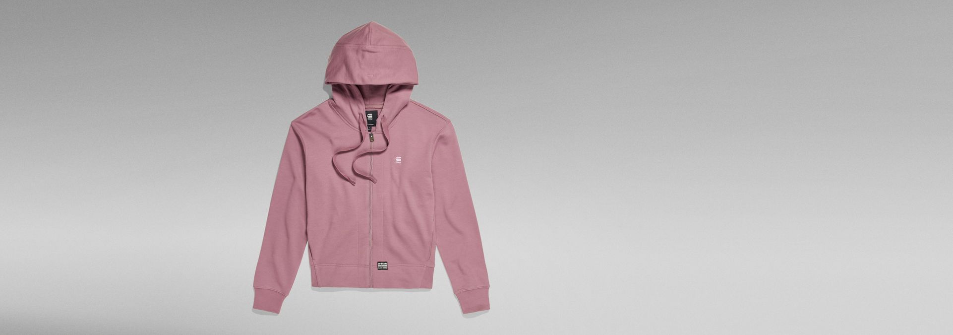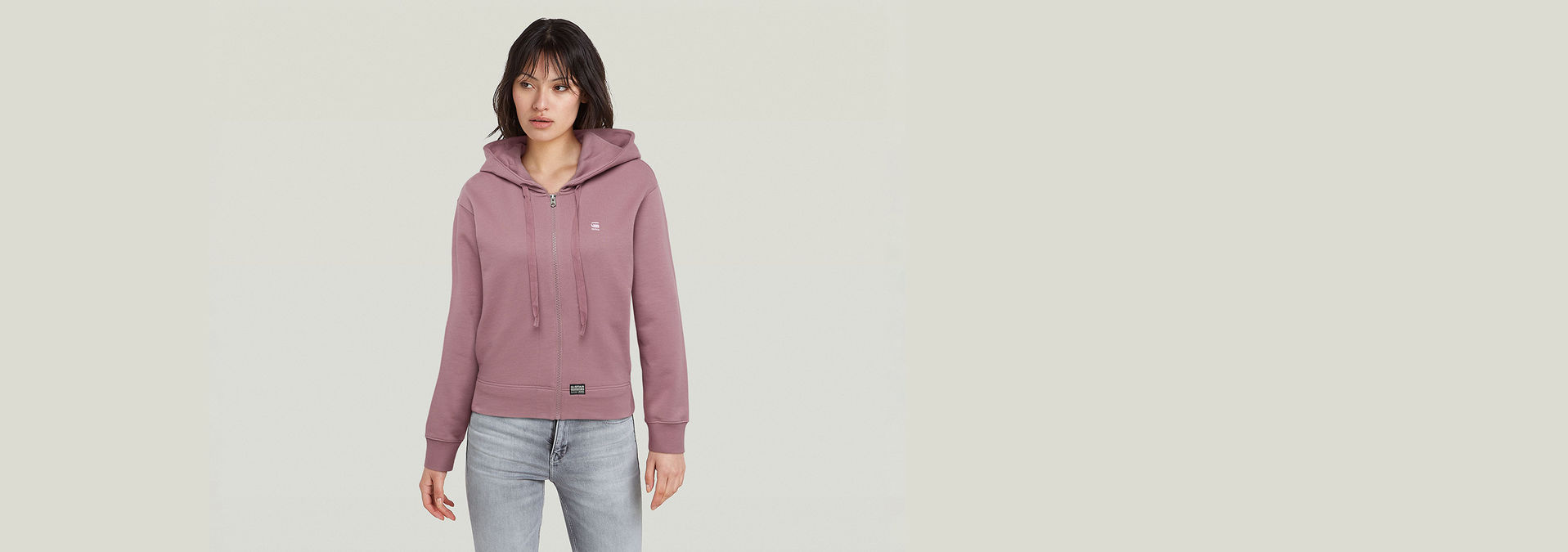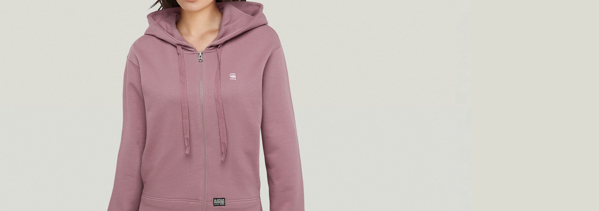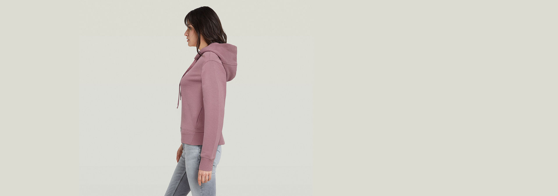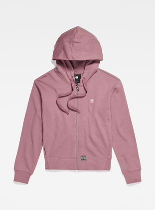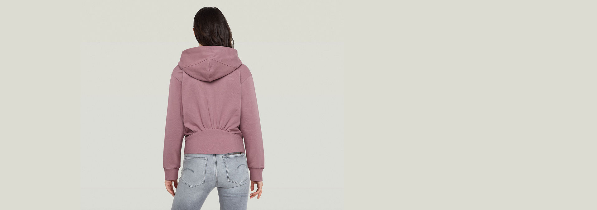 This Fyx biker hooded sweater offers a full zip closure. The hood is designed with a raised front and wide drawstrings. At the backside of the waist a curved rib adds a comfortable finish. The pleats caught in the curved seam above, add volume to the back. This hoodie has side seam pockets. A G-Star RAW logo is added to the chest.