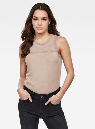 The mesh tanktop optic slim shows a rib finish at the neck and armholes. Mesh paneling is created at the upper front and backside. A small button closure at the back neck closes the placket, created out of herringbone tape. This overdyed style offers unique color shading and a soft touch. The hem is rounded.