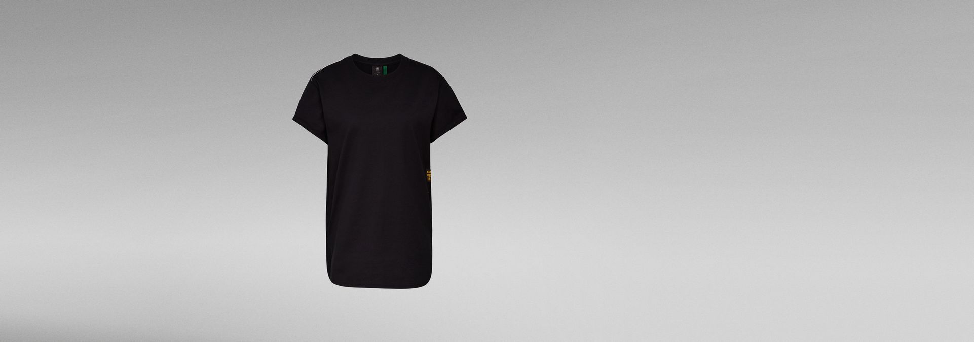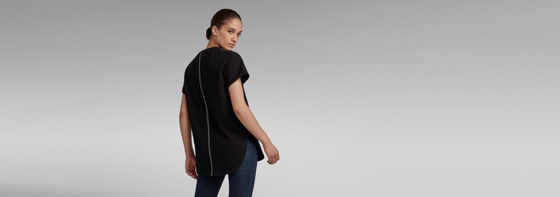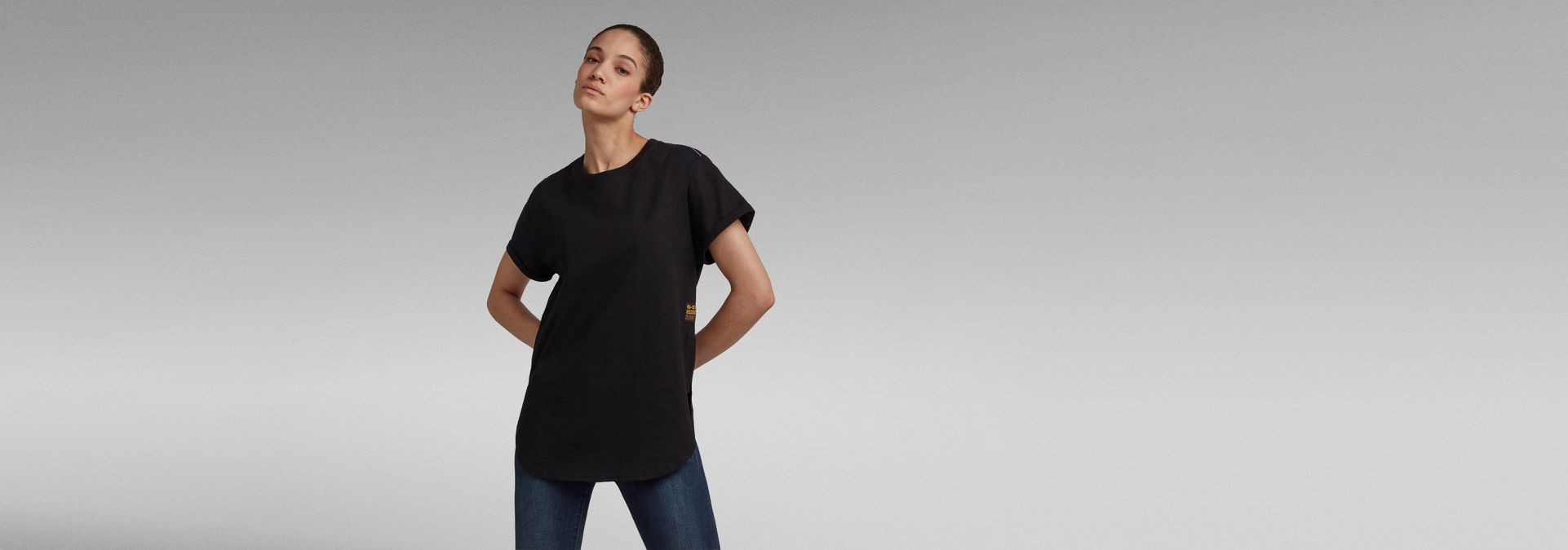 This loose fitted tee offers a ribbed rounded neckline. Short sleeves show a foldover edge. This tee is designed with deep side slits and a curved hem.