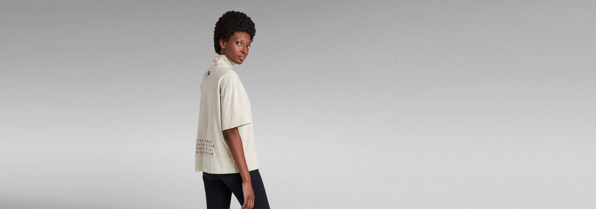 T-Shirt Loose Graphic offers a funnel neck on an overall loose fit. As the shoulders are widened, the sleeves become a bit longer. This funnel T-Shirt has a straight hem with slits on both sides. The graphic prints at the chest and lower back make it complete.