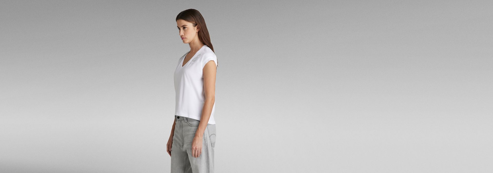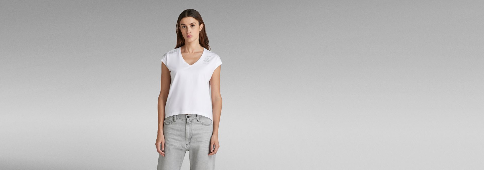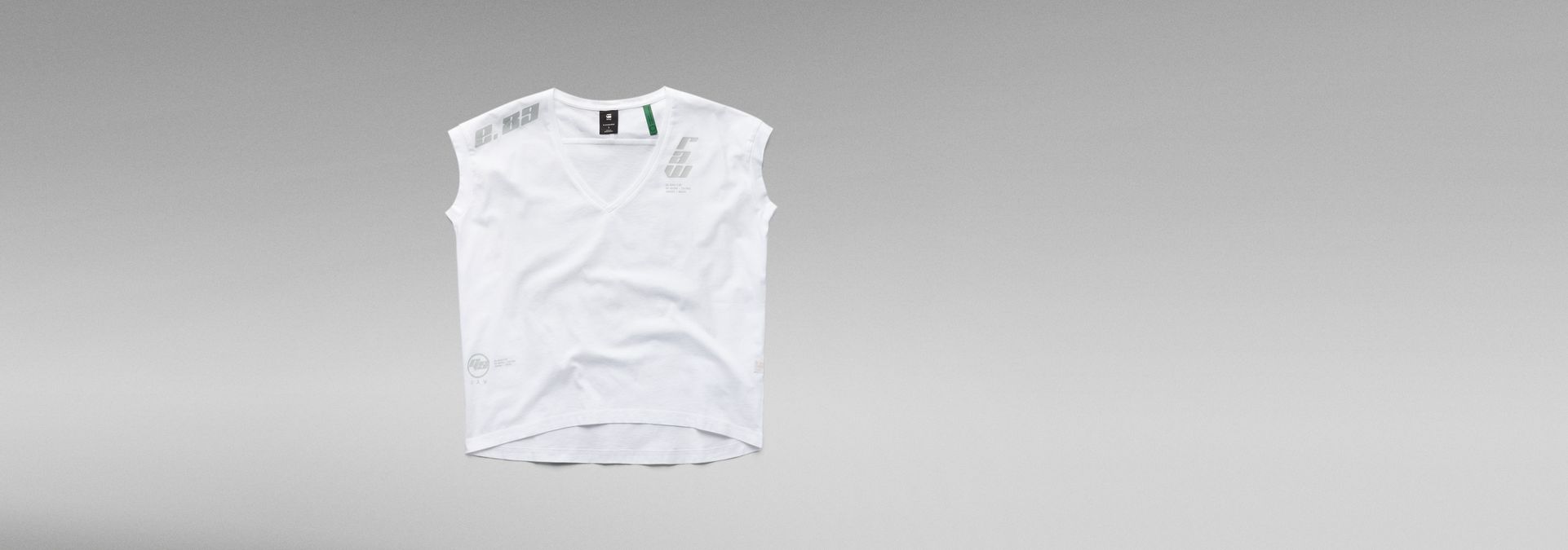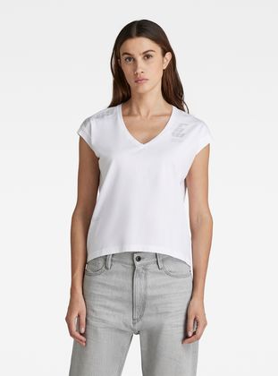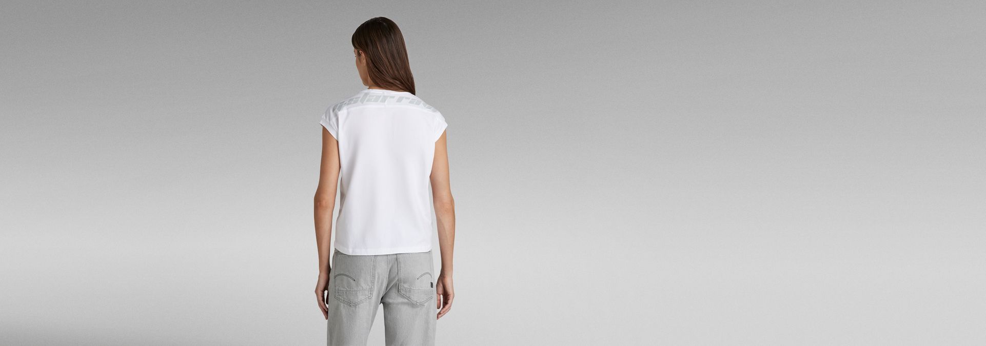 The design of this Sports Back Graphic T-Shirt gives a special effect. As the front panel is cut wider, a flared silhouette is created. Combined with a wider shoulder, a small sleeve appears. This V-neck T-Shirt shows graphic prints at the front shoulder and upper back.
