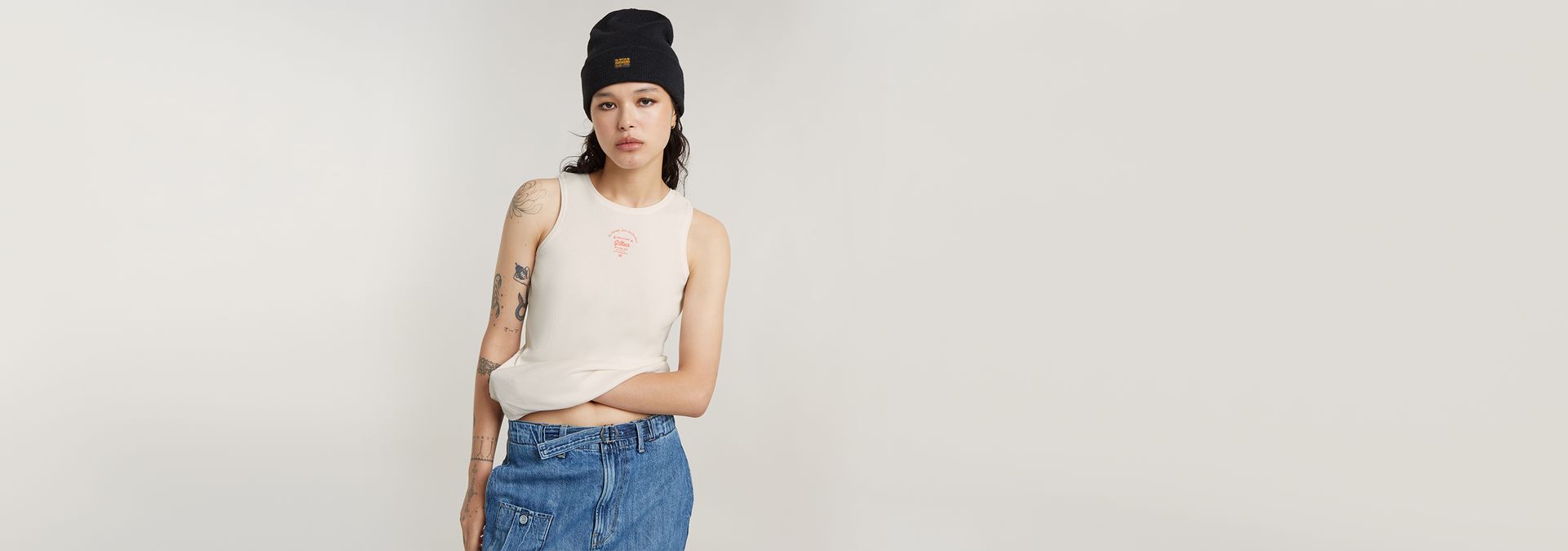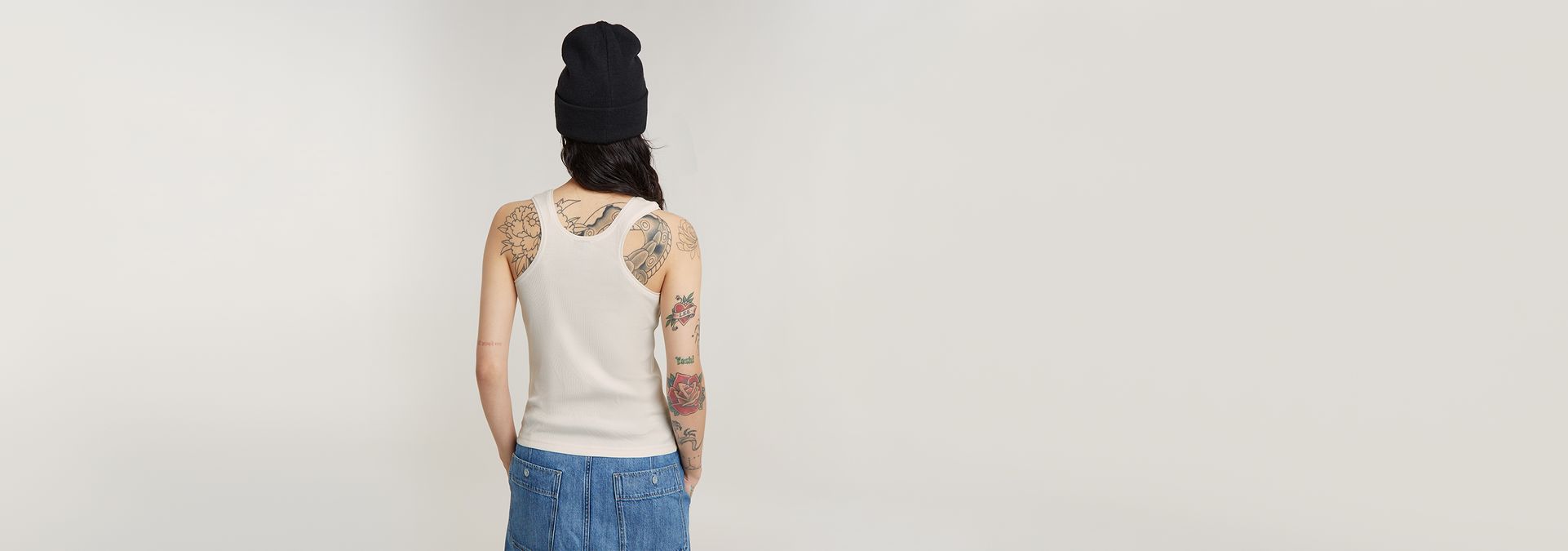 Ribbed tank top Racerback is created in a slim fit. A binding is added to the neckline and armholes. At the upper back, a graphic print is set. The woven G-Star RAW label at the lower front signs it off.