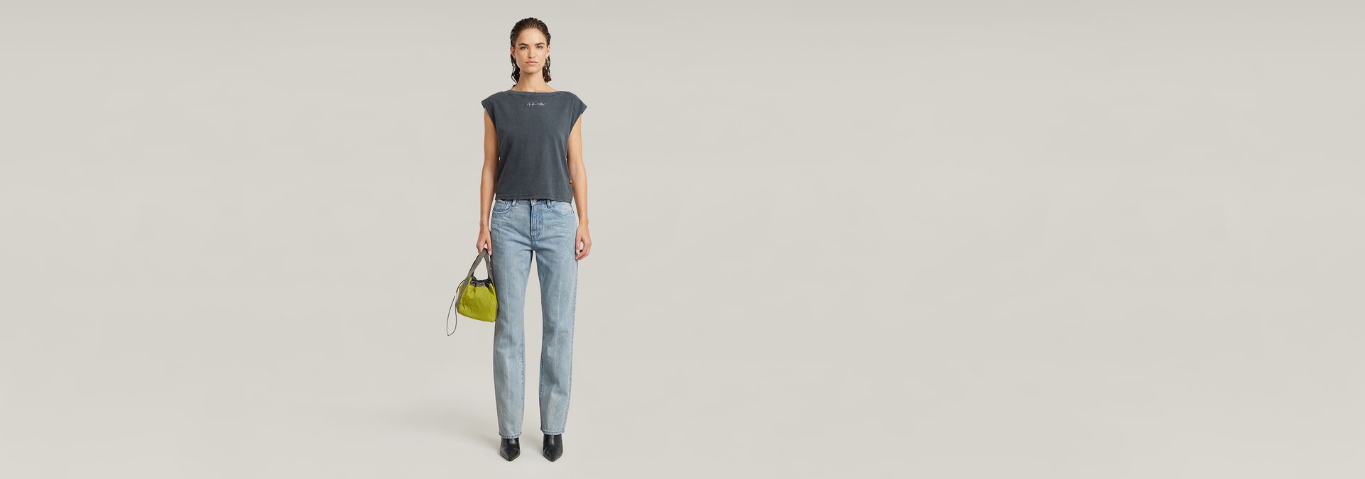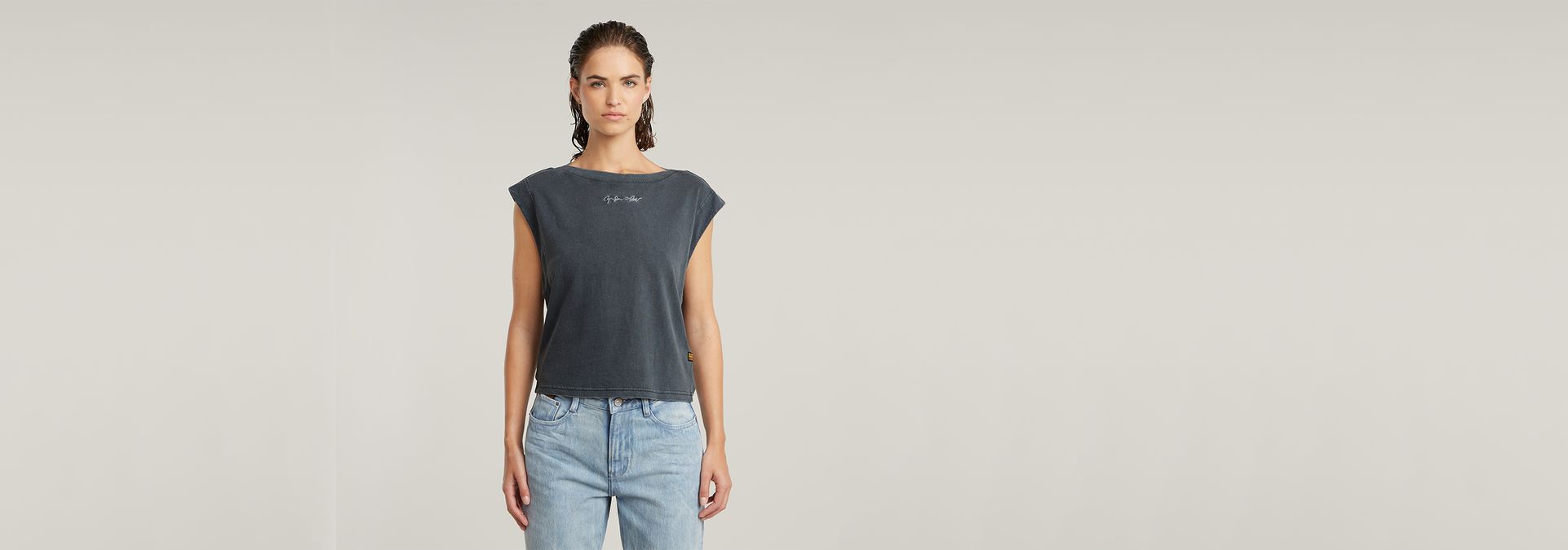 Top Mini G-Script Logo Overdyed is cut in a regular fit and offers widened shoulders. The armholes are cut deep and are partly covered by a gusset piece.