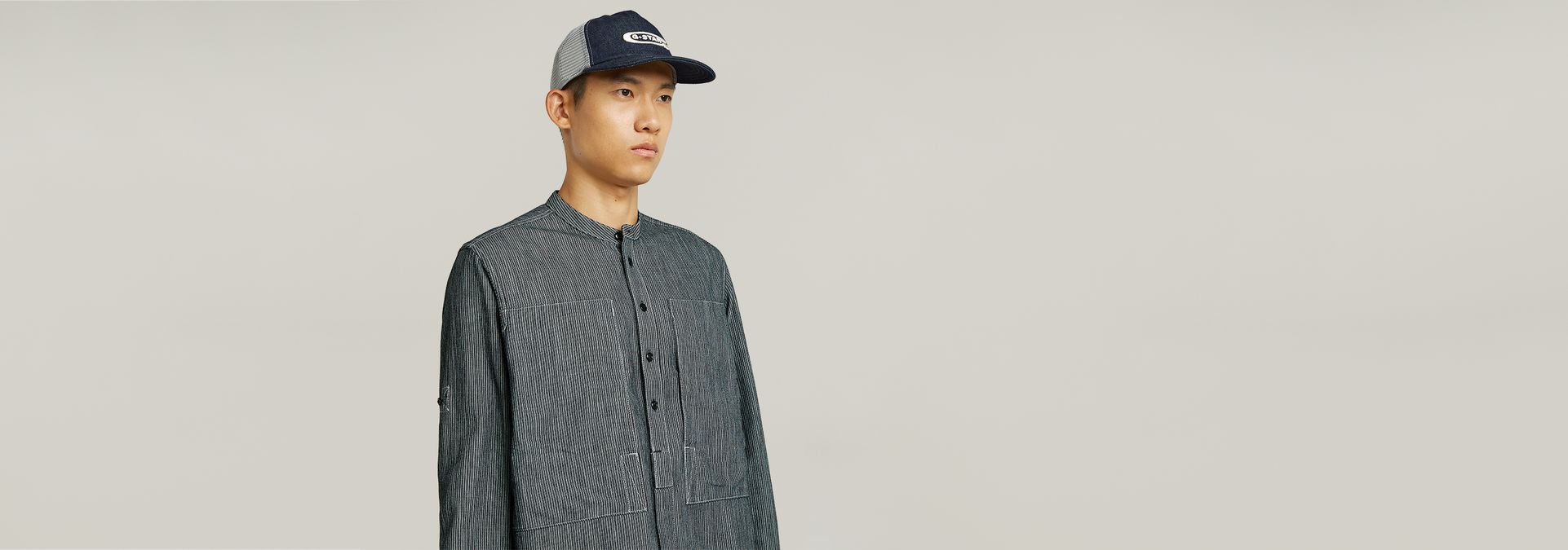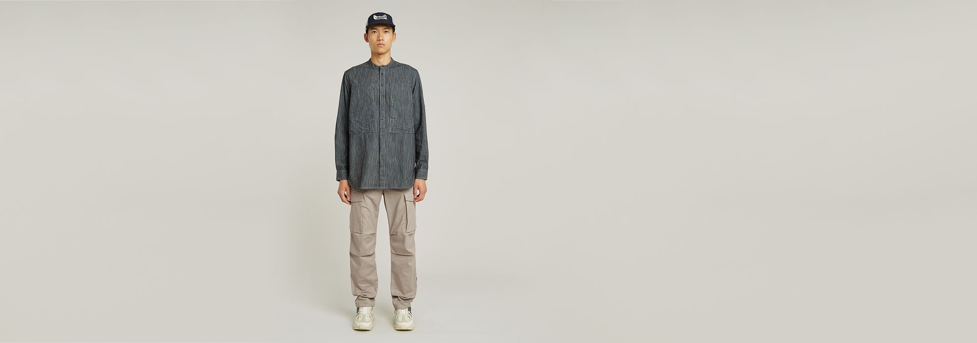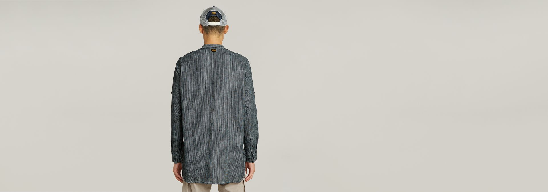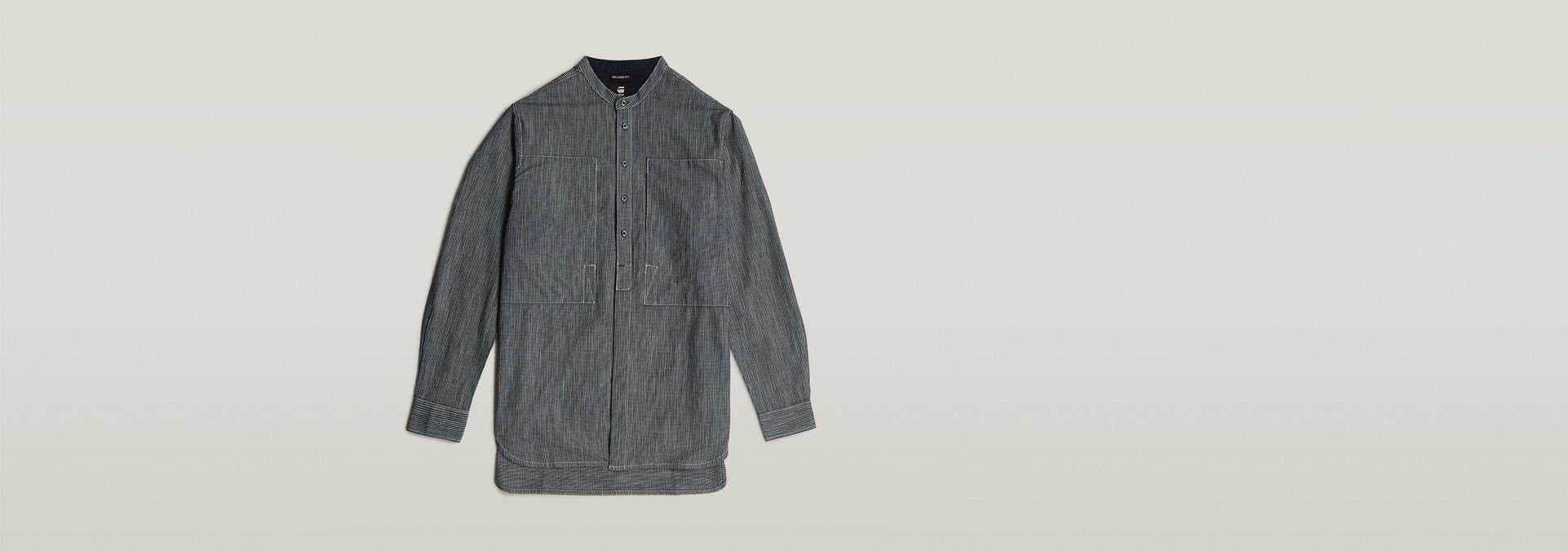 El cuello enrollable de la camisa Stand está diseñado con un corte relajado y manga larga enrollable hasta una longitud más corta. Se fija con los cierres a presión. Esta camisa tiene un cuello de banda estrecho y un cierre de botones parcialmente oculto. Los bolsillos inclinados en el pecho rematan el modelo.