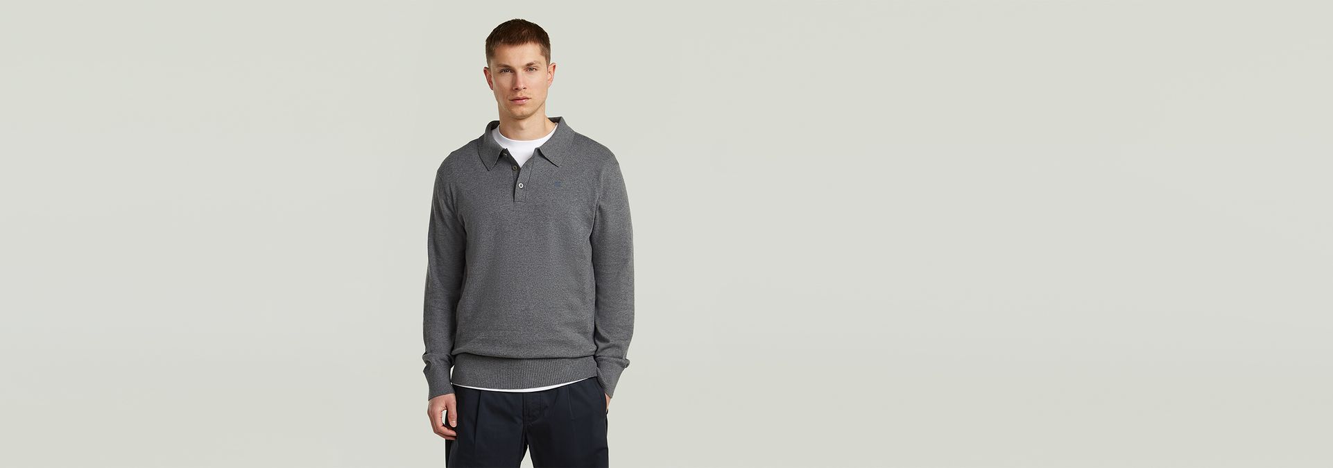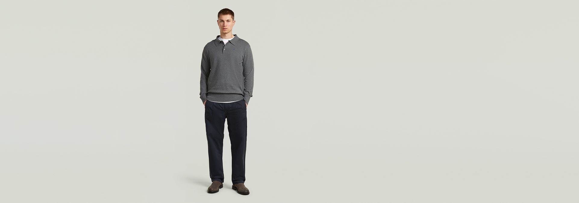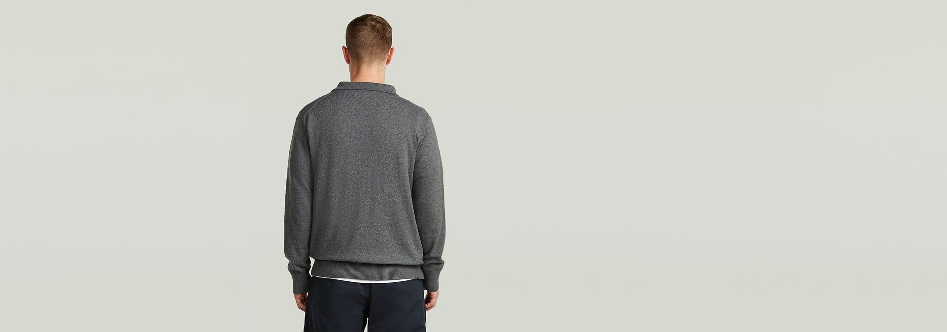 El polo Willem de manga larga de nuestra línea Correct está confeccionado con una mezcla pesada de algodón ecológico y cachemir. Presenta un corte recto con cuello estructurado, cierre de botones y puños de canalé.