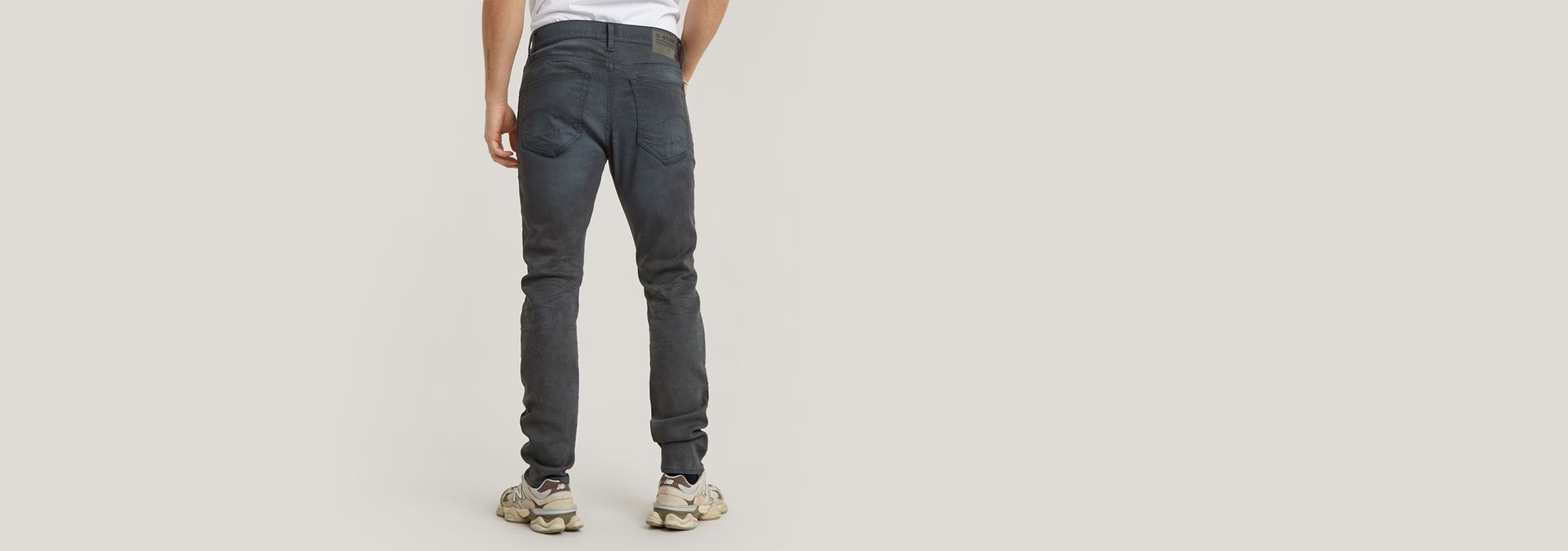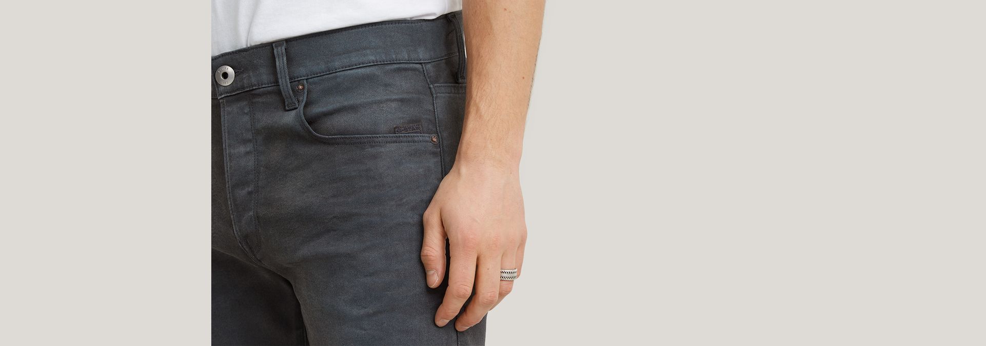 El modelo 3301 Slim Jeans está confeccionado en denim suave con una potente elasticidad y una gama de gris industrial.