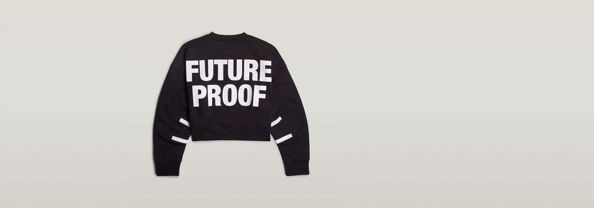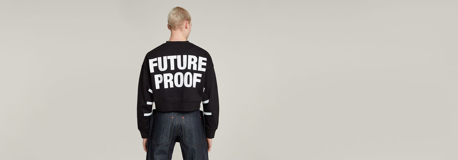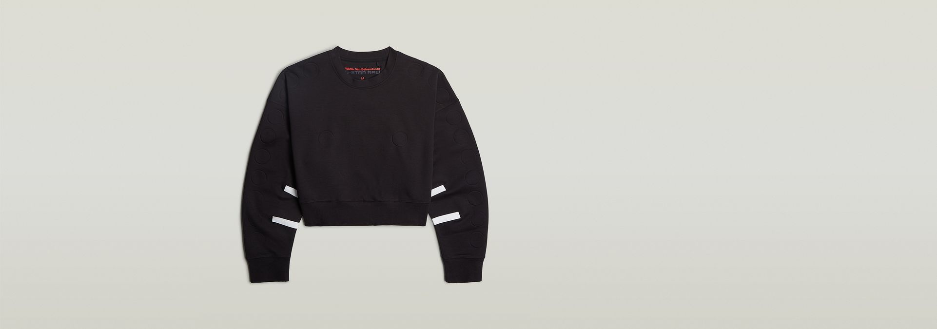 Diseñada por Walter Van Beirendonck, la sudadera corta unisex fue creada con costuras mínimas, experimentando con pegamento y cinta. Presenta un corte extragrande, cuello redondo y pelotas en relieve 3D en la parte delantera y en las mangas. El eslogan de Van Beirendonck "Future Proof" está impreso en la parte posterior.