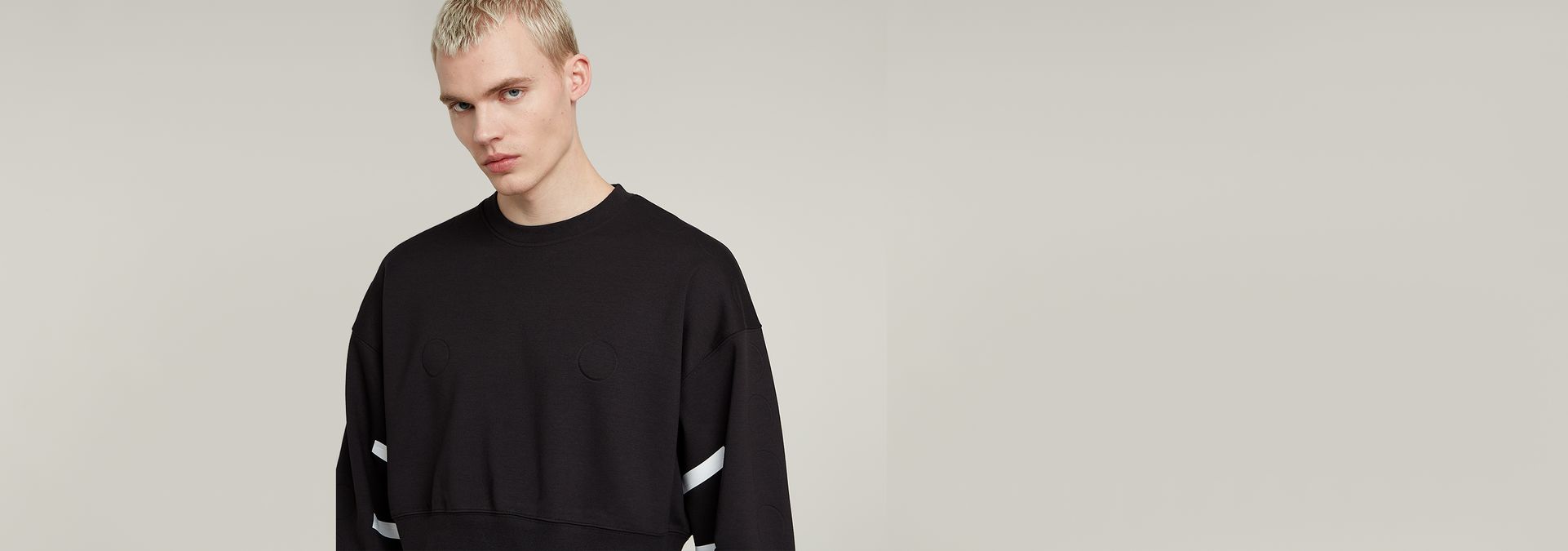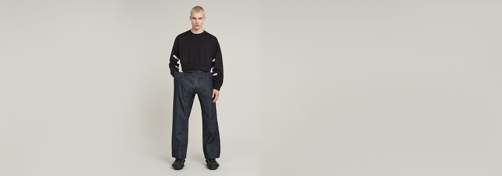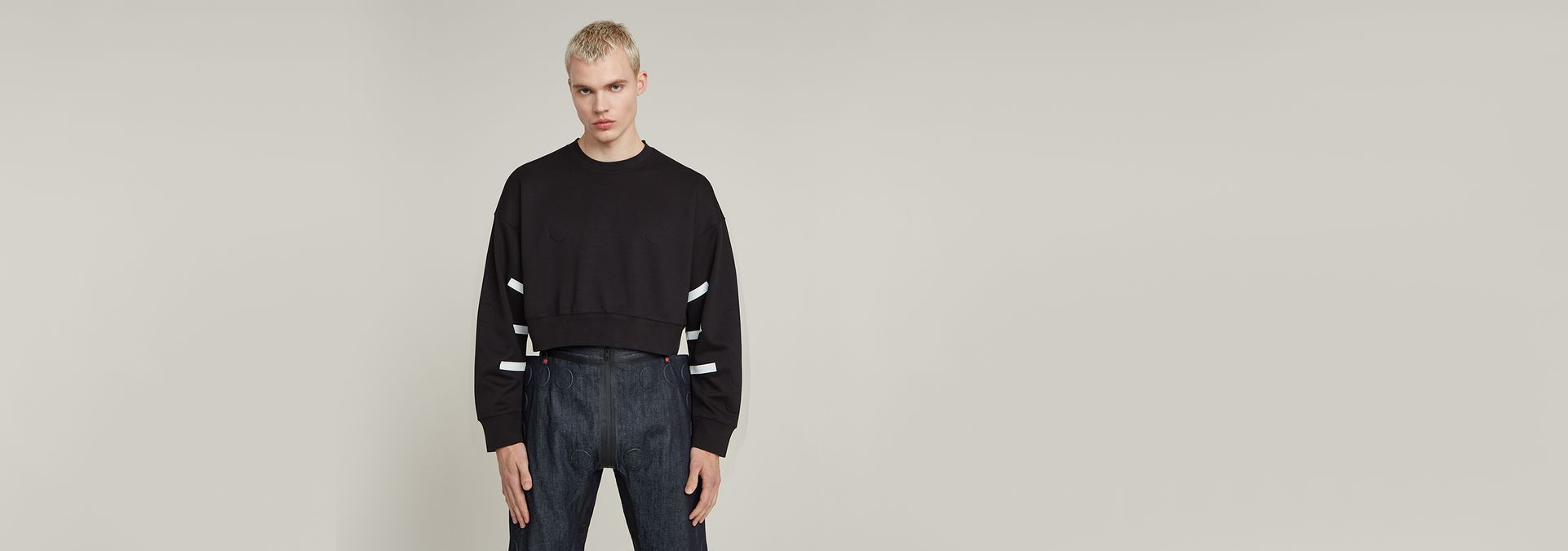 Diseñada por Walter Van Beirendonck, la sudadera corta unisex fue creada con costuras mínimas, experimentando con pegamento y cinta. Presenta un corte extragrande, cuello redondo y pelotas en relieve 3D en la parte delantera y en las mangas. El eslogan de Van Beirendonck "Future Proof" está impreso en la parte posterior.