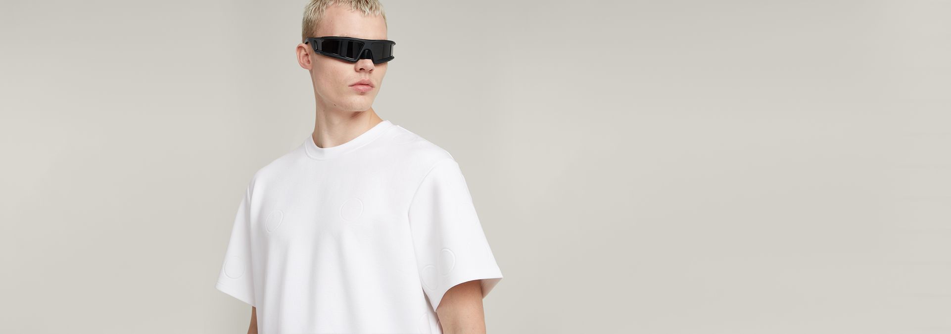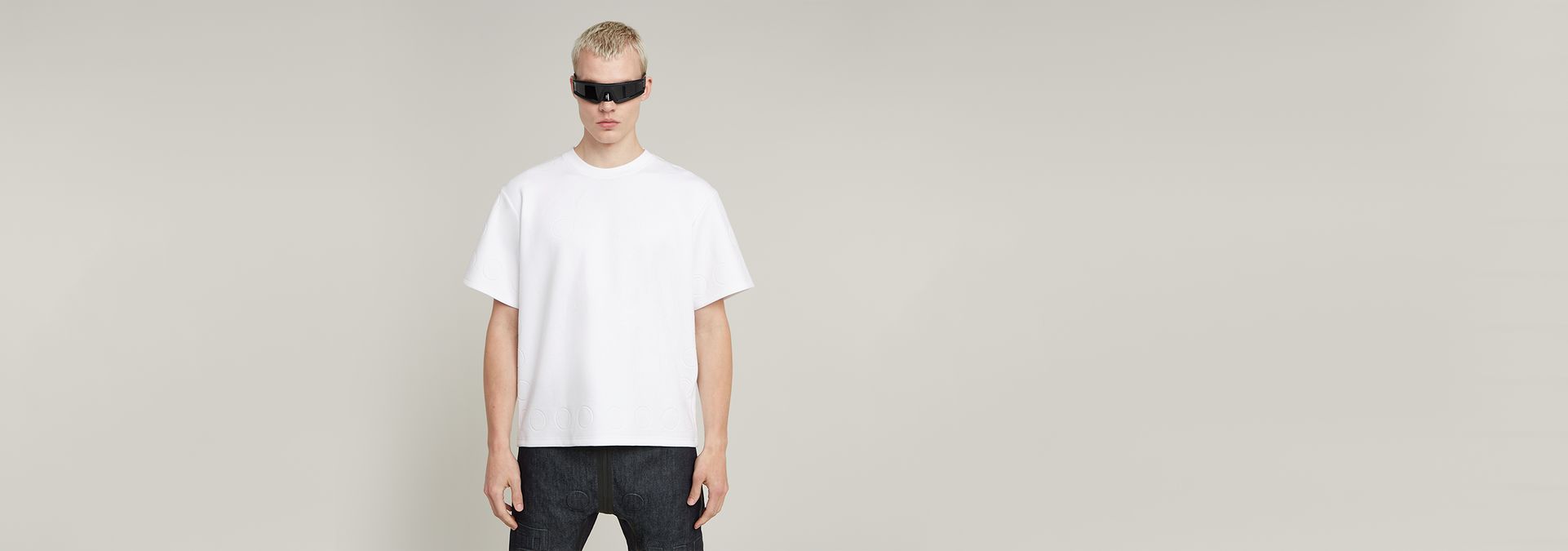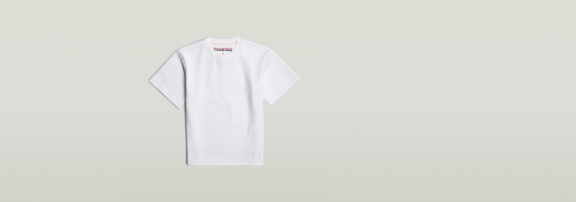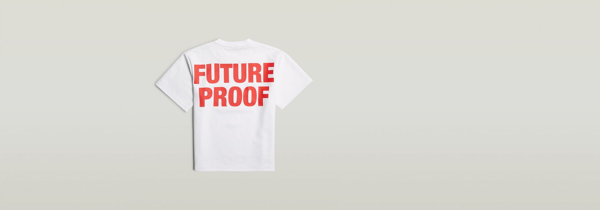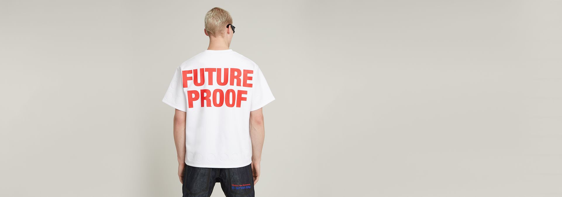 Diseñada por Walter Van Beirendonck, la camiseta Boxy unisex fue creada con costuras mínimas, experimentando con pegamento y cinta adhesiva. Presenta cuello redondo y pelotas en relieve 3D en la parte delantera y en las mangas. El eslogan de Van Beirendonck "Future Proof" está impreso en la parte posterior.
