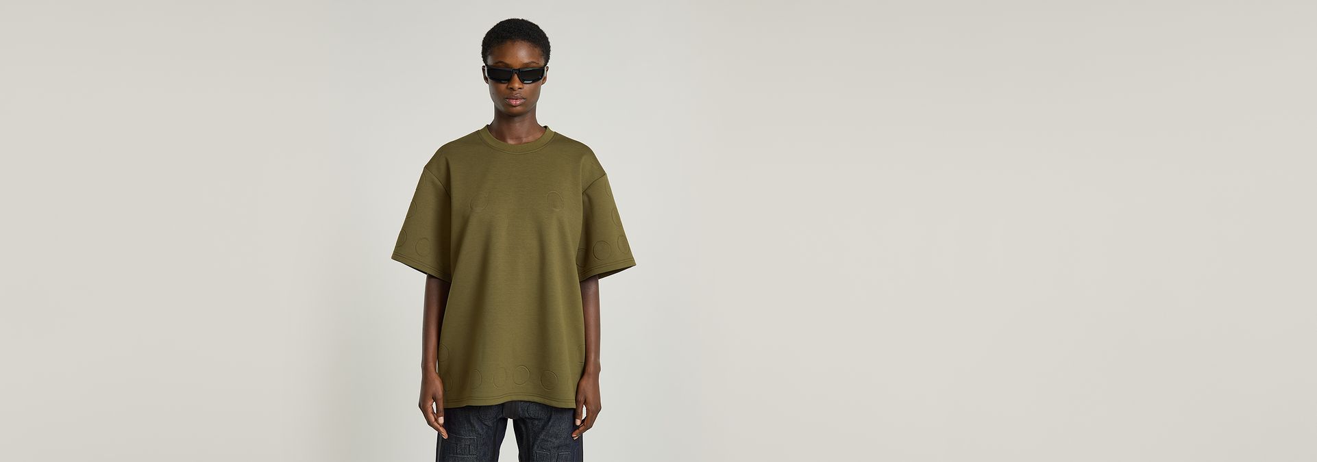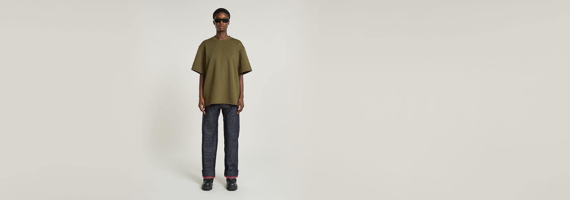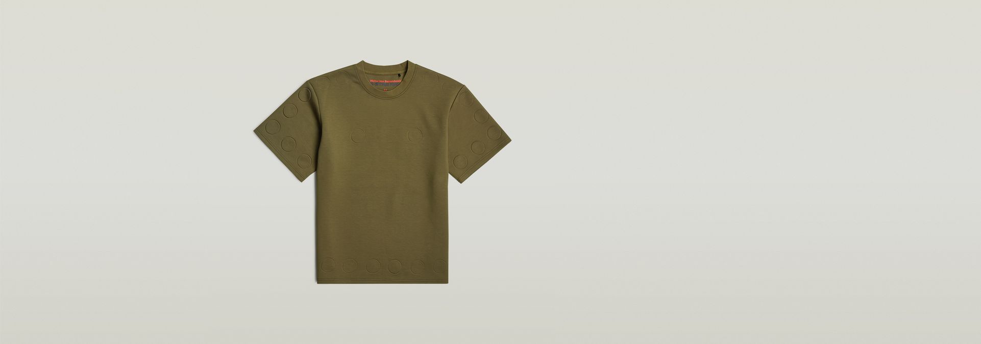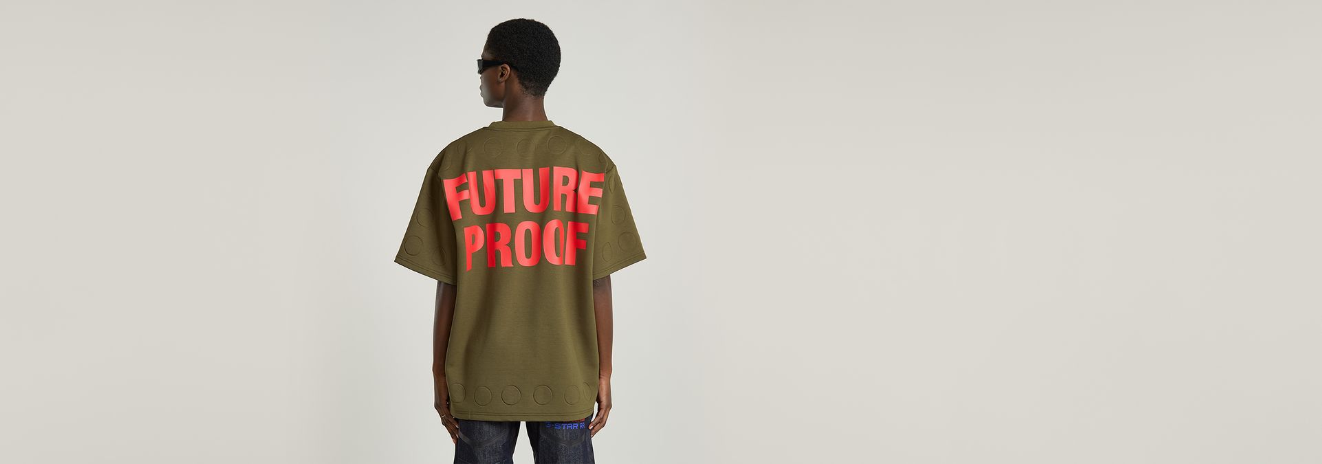 Diseñada por Walter Van Beirendonck, la camiseta Boxy unisex fue creada con costuras mínimas, experimentando con pegamento y cinta adhesiva. Presenta cuello redondo y pelotas en relieve 3D en la parte delantera y en las mangas. El eslogan de Van Beirendonck "Future Proof" está impreso en la parte posterior.