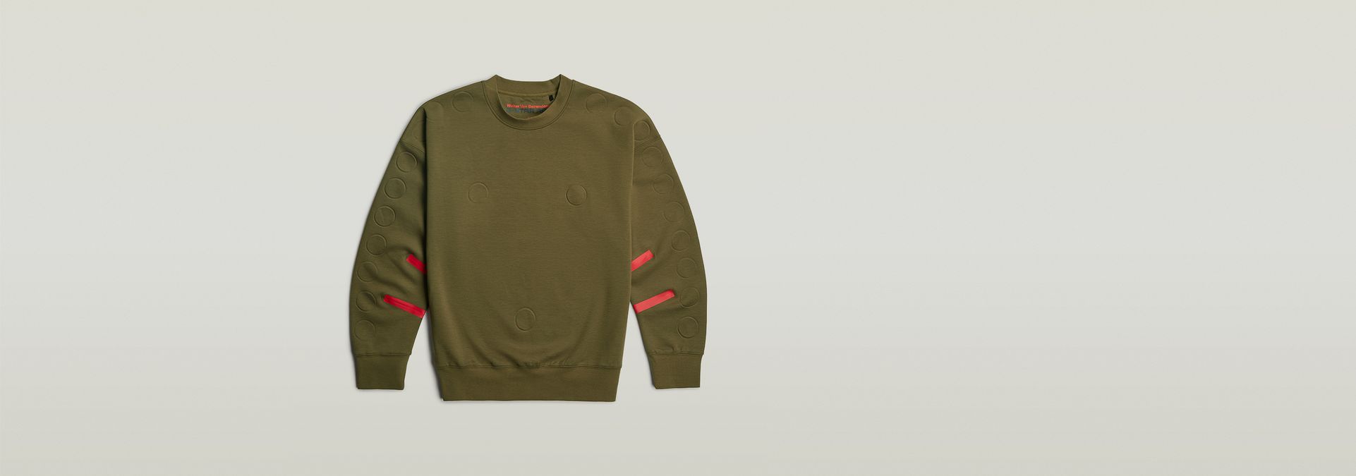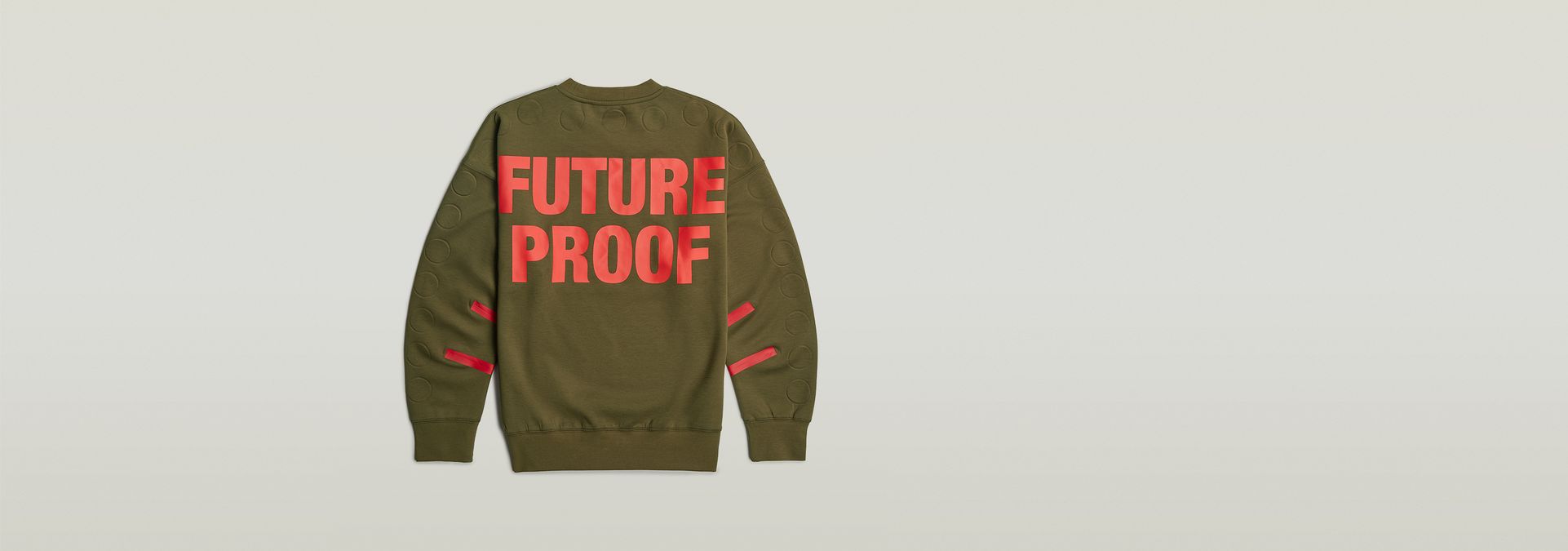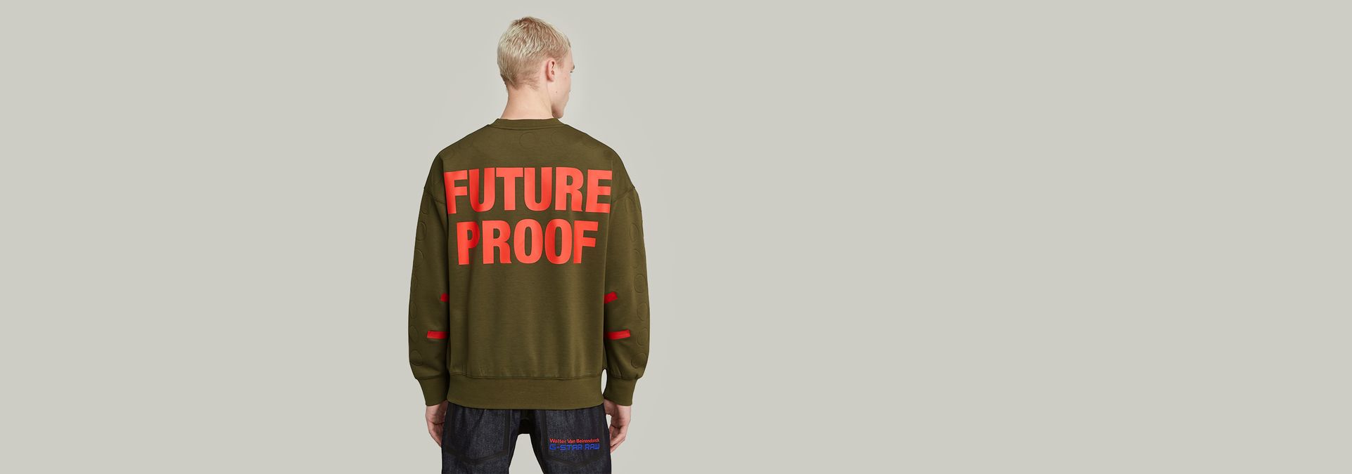 Diseñada por Walter Van Beirendonck, la sudadera unisex extragrande fue creada con costuras mínimas, experimentando con pegamento y cinta. Presenta un corte extragrande, cuello redondo y pelotas en relieve 3D en la parte delantera y en las mangas. El eslogan de Van Beirendonck "Future Proof" está impreso en la parte posterior.