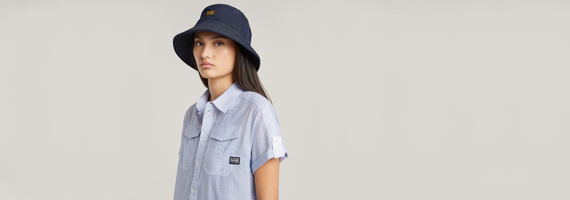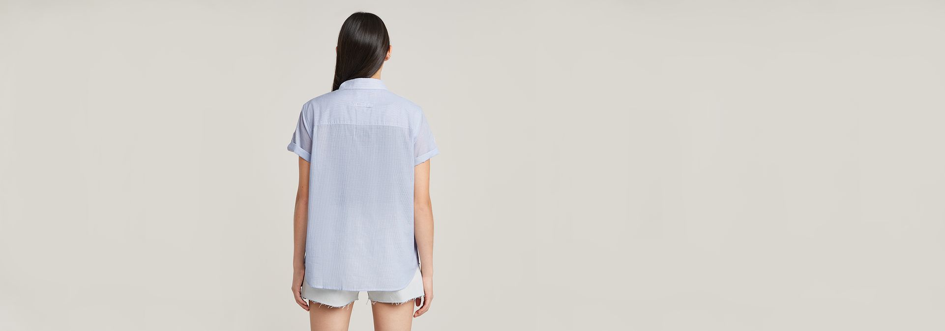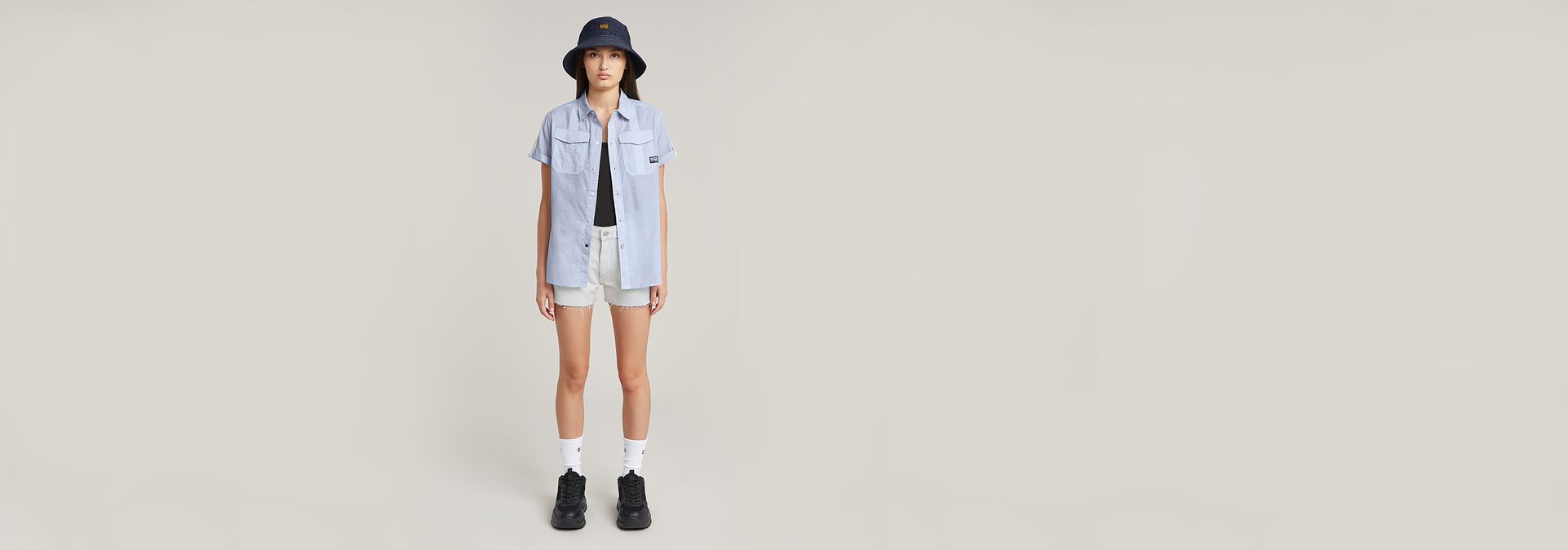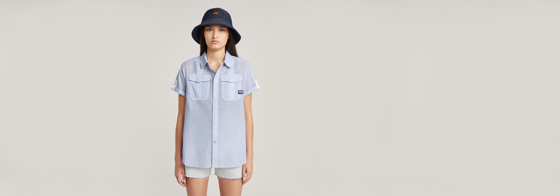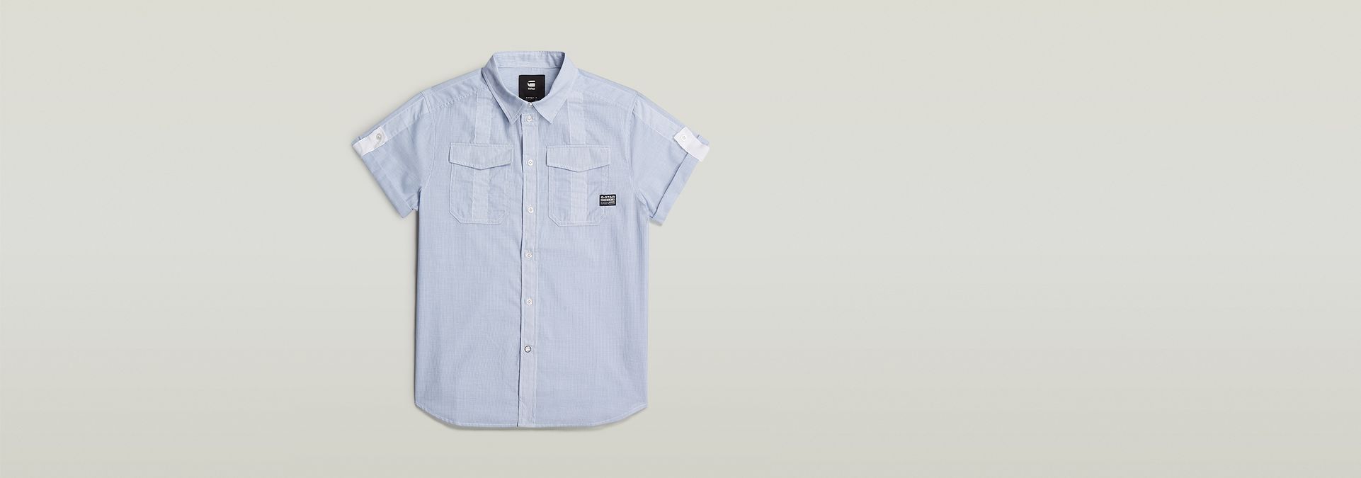 La camisa de botones tiene un corte recto y el bajo redondeado. Las mangas enrolladas se enganchan con una lengüeta y un botón. Los bolsillos con solapa en el pecho rematan el modelo.